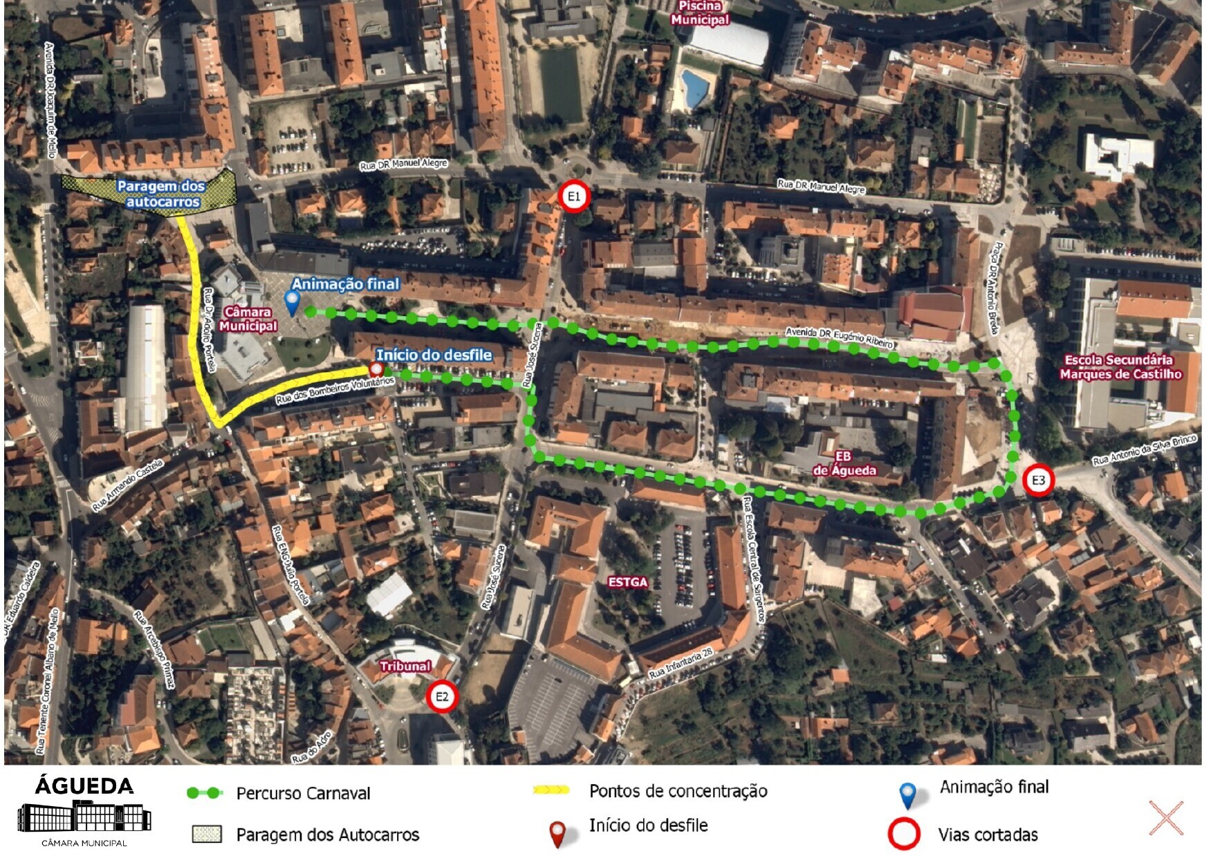 O desfile terá início às 14h00, na Rua dos Bombeiros Voluntários, e termina por volta das 17h00, na Praça do Município, conforme o mapa do percurso anexo.