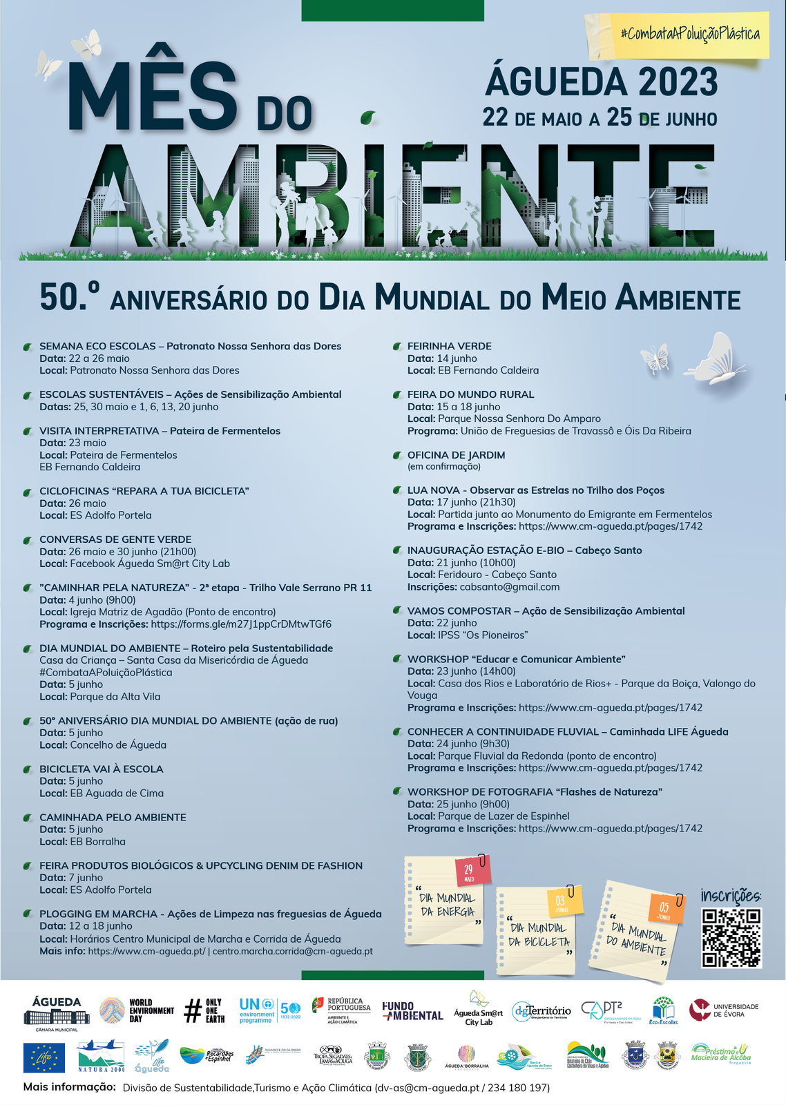 A Câmara de Águeda, com o 50.º aniversário do Dia Mundial do Meio Ambiente como pano de fundo e com o combate à poluição plástica como alerta, está a promover, desde segunda-feira (22 de maio) e até ao próximo dia 25 de junho, um vasto conjunto de ações que têm por objetivo sensibilizar a população para as problemáticas relacionadas com o meio ambiente.