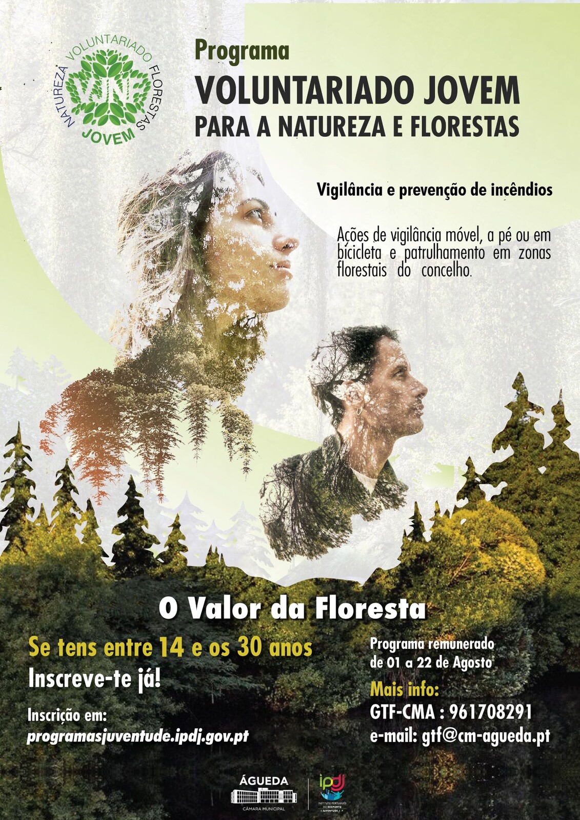 A Câmara Municipal de Águeda tem abertas as inscrições para o programa “Voluntariado Jovem para a Natureza e Florestas”. A ação, desenvolvida em parceria com o Instituto Português da Juventude (IPDJ), vai decorrer de 1 a 22 de agosto e envolverá jovens entre os 14 e 30 anos, que farão vigilância nas várias áreas florestais do concelho.