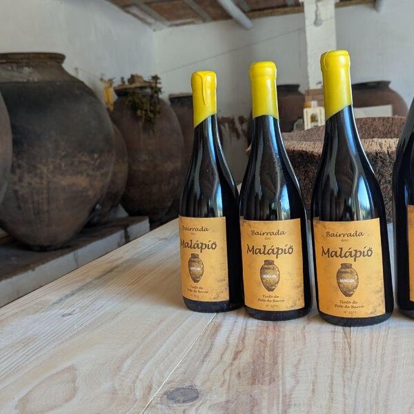 • Visita + Prova de 2 vinhos de talha Malápio DOC Bairrada na Adega Malápio + Tábua de Petiscos (queijo, chouriça, pão)