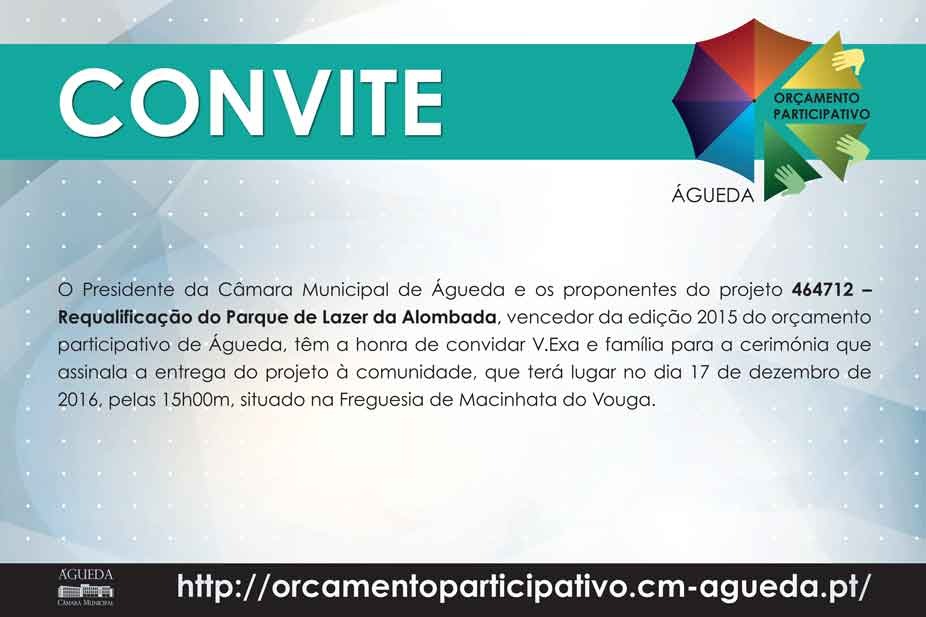 O Presidente da Câmara Municipal de Águeda e os proponentes do projeto 464712 – Requalificação do Parque de Lazer da Alombada, vencedor da edição 2015 do orçamento participativo de Águeda, têm a honra de convidar V.Exa e família para a cerimónia que assinala a entrega do projeto à comunidade, que terá lugar no dia 17 de dezembro de 2016, pelas 15h00m, situado na Freguesia de Macinhata do Vouga.
