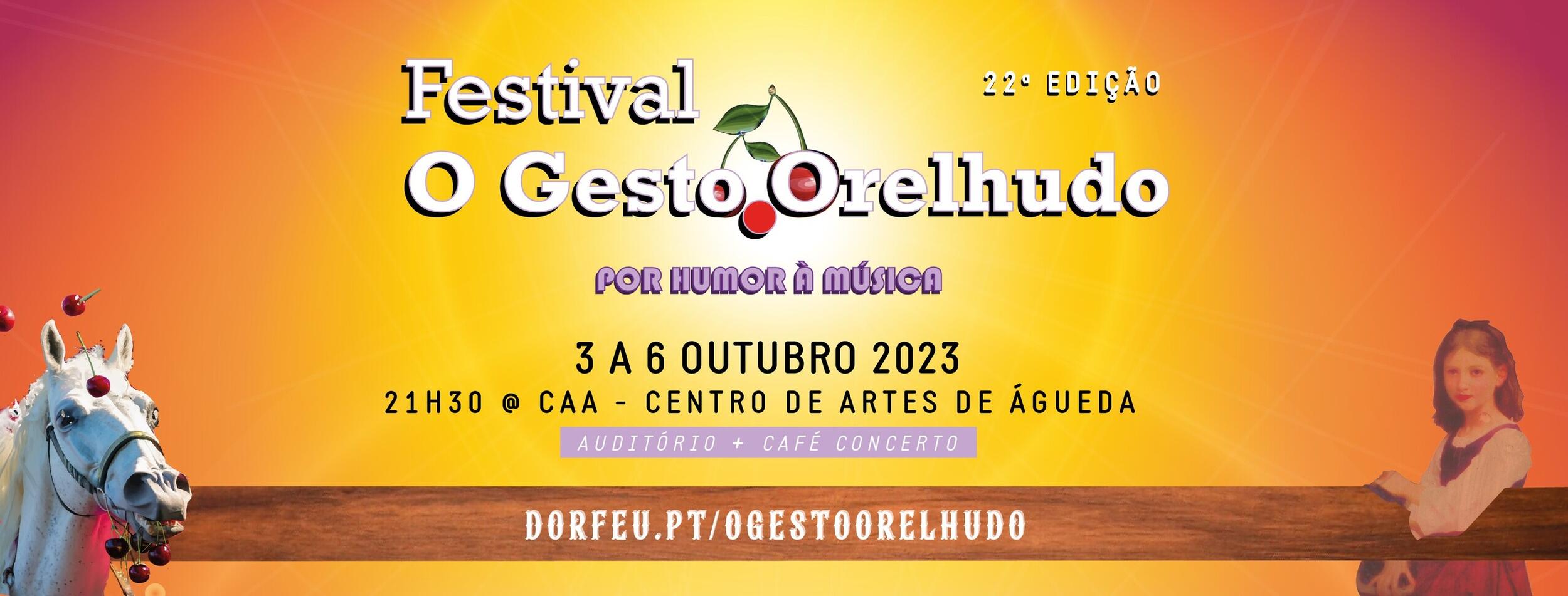 Musicomédia ou a arte de abanar as orelhas. A 22ª edição do Festival O Gesto Orelhudo instala-se no CAA, de 3 a 6 de outubro. Entre o Auditório principal e o Café-Concerto, há espetáculos de Portugal, Itália, França, Espanha, tudo. E, claro, o Bar Orelhudo também vai marcar presença. Sempre por humor à música!