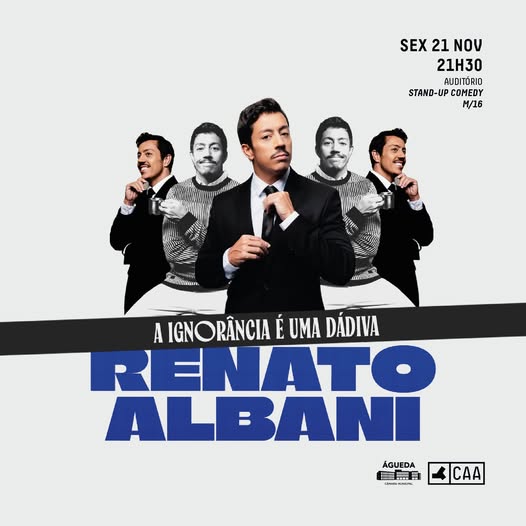 Renato Albani apresenta o seu espetáculo "𝗔 𝗜𝗴𝗻𝗼𝗿â𝗻𝗰𝗶𝗮 é 𝘂𝗺𝗮 𝗱á𝗱𝗶𝘃𝗮", no Centro de Artes de Águeda, no dia 21 de novembro, sexta-feira, às 21h30.