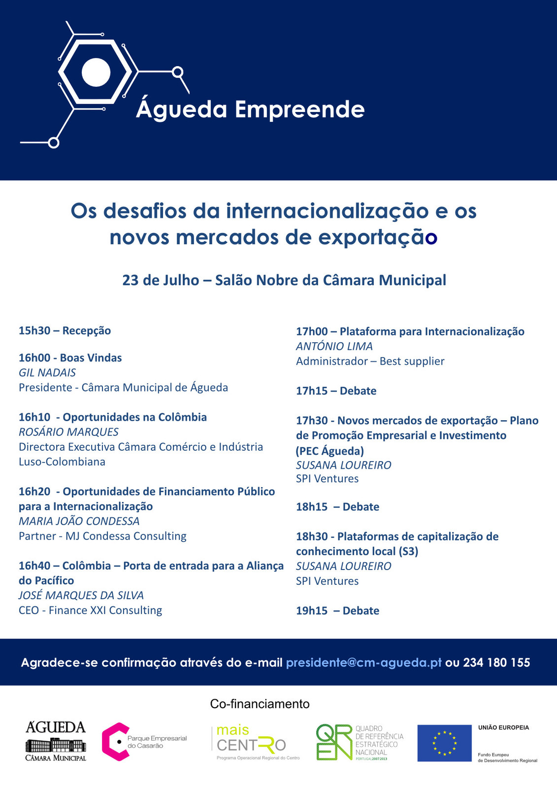 • a apresentação do Plano de Promoção Empresarial e Investimento orientado para a captação de investimento para o concelho de Águeda, onde se pretende identificar os mercados estratégicos para Águeda quer em termos de exportação, quer em termos de captação de investimento com vista à instalação de novas empresas ou estabelecimento de parcerias comerciais;