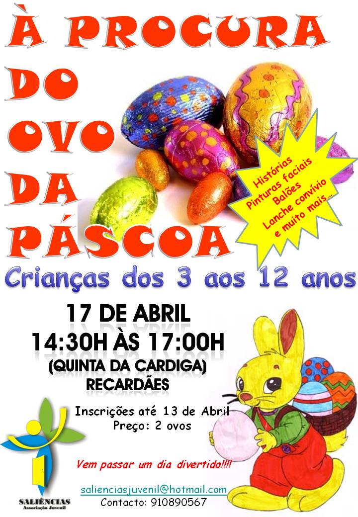 Adicionar a calendário2011-04-17 15:30:002011-04-17 18:00:00Europe/LisbonActividade "À procura do Ovo da Páscoa" [da Associação Juvenil Saliências] Quinta da Cardiga, Recardães
