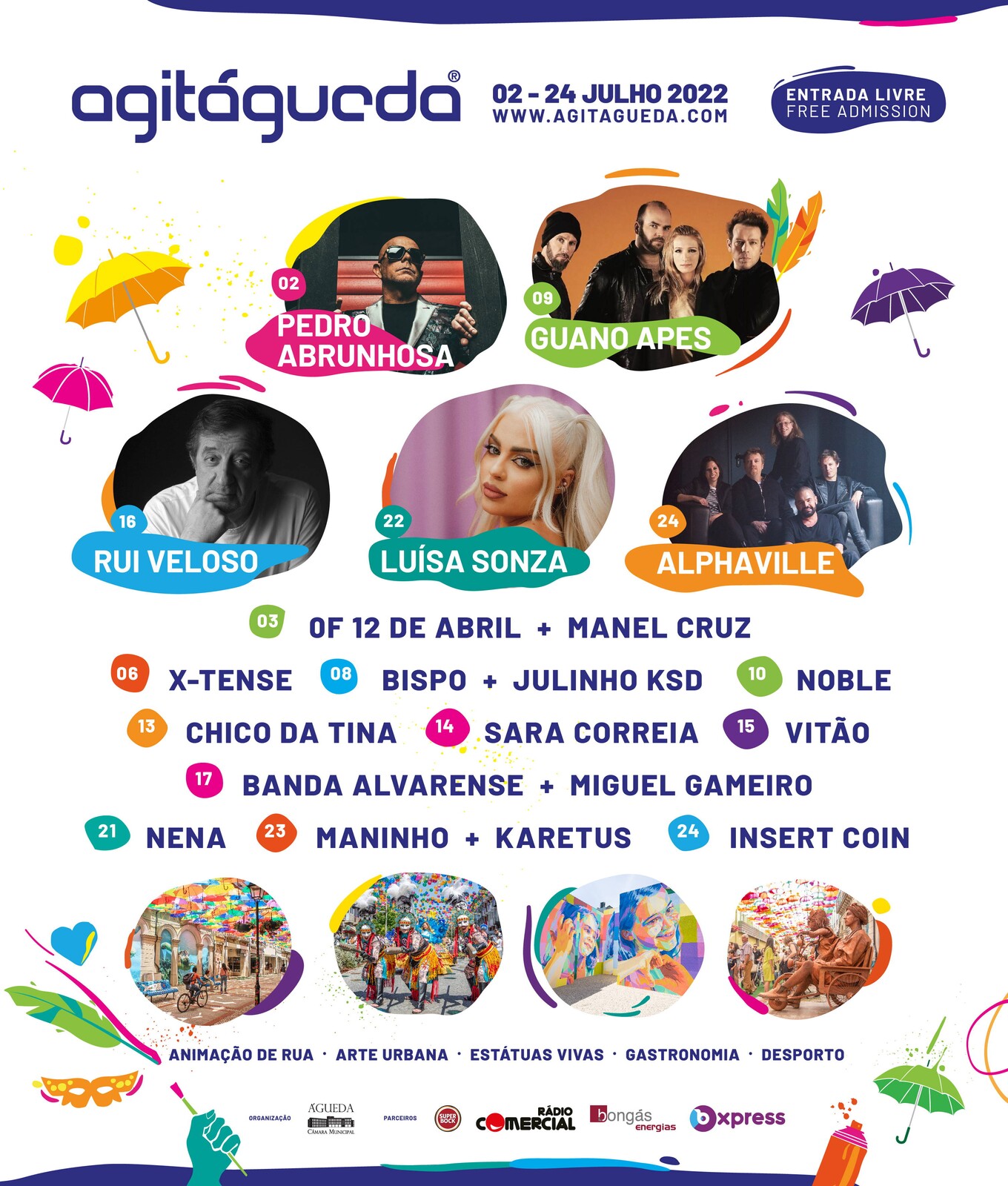 O AgitÁgueda 2022 realiza-se de 2 a 24 de julho, com uma programação ambiciosa, que traz grandes nomes da música nacional e internacional, dirigido a vários tipos de públicos, para além de todo um conjunto de animação de rua (como o Carnaval Fora d’Horas, o Color Day, o Mad Parade, Videomapping), a Feira de Artesanato, as Estátuas Vivas, a arte urbana, sem esquecer as atividades desportivas e lúdicas, bem como a instalação dos guarda-chuvas coloridos, a imagem de marca de Águeda. Uma das grandes novidades este ano é a colocação de uma piscina fluvial.