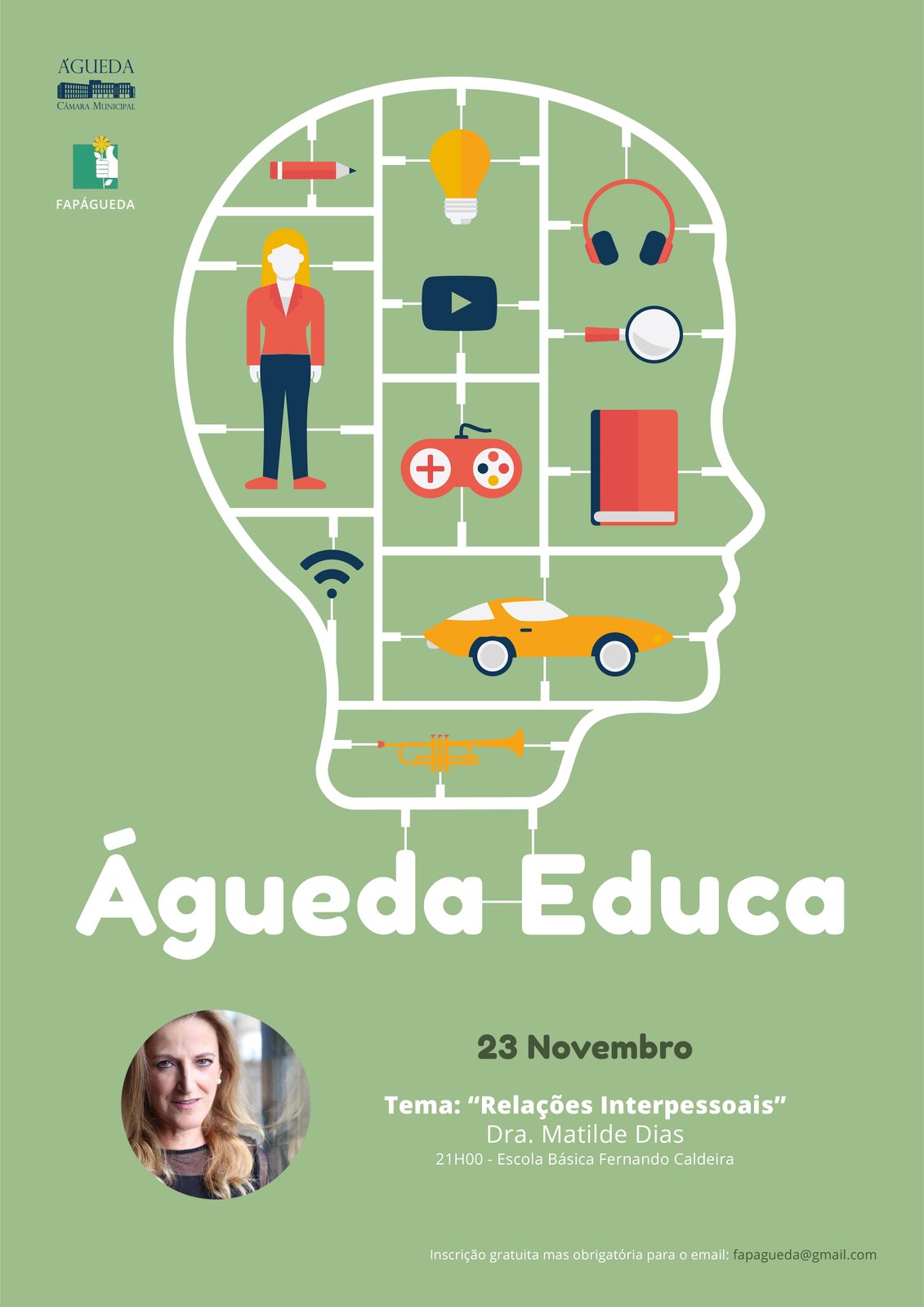 O mês de novembro receberá a Dra. Matilde Dias (Psicóloga Clínica, Formadora Acreditada, Mentora, Coordenadora e Formadora no Projeto Escola de Pais - Formação Educação Parental) no dia 23, pelas 21:00 horas, na Escola Básica Fernando Caldeira, para tratar as Relações Interpessoais, de modo a consciencializar para a importância das boas relações no meio familiar, escolar e em sociedade, bem como discutir boas práticas.