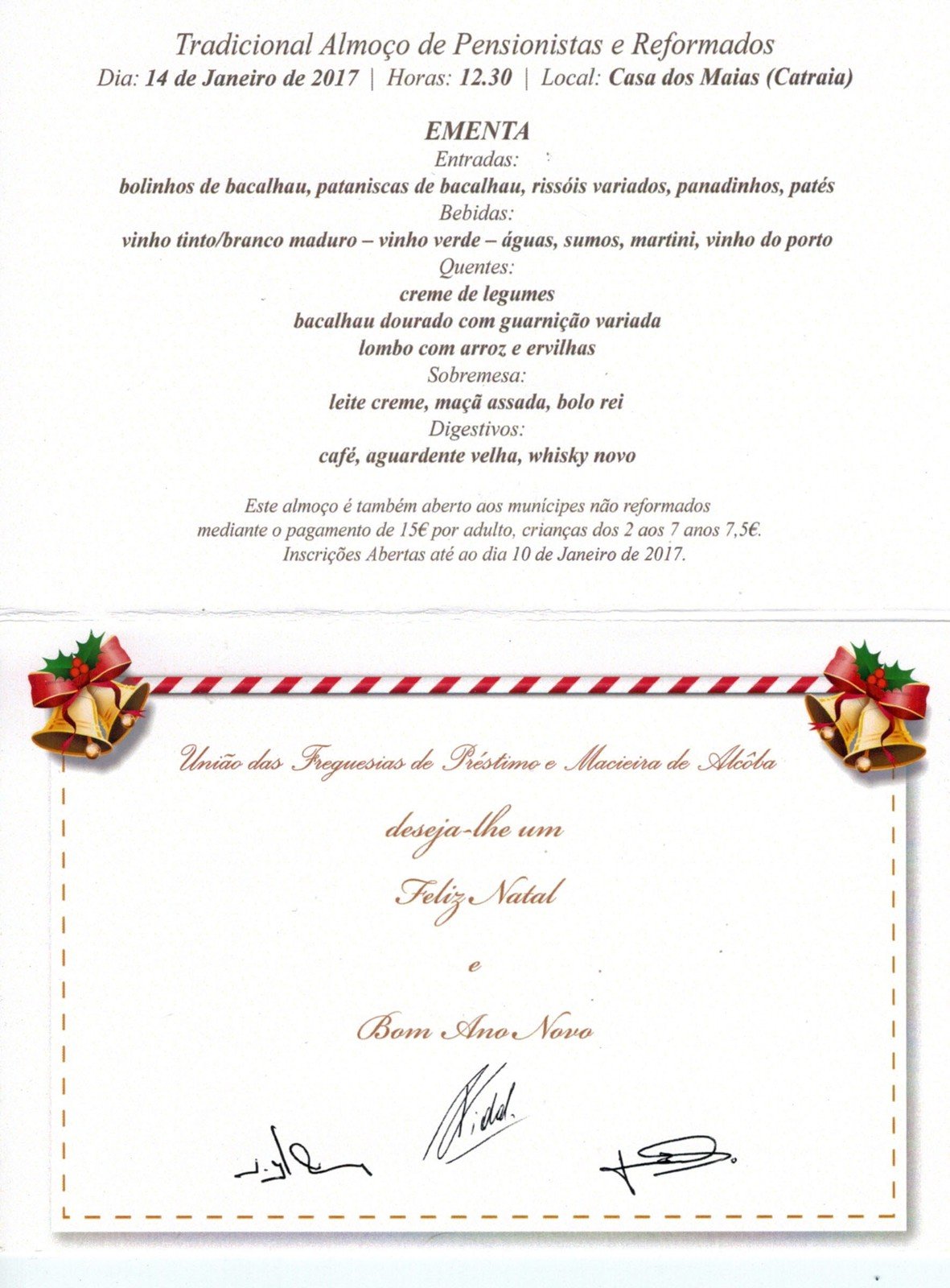 No dia 14 de janeiro, sábado, vai realizar-se o tradicional almoço de Reis promovido pela Junta de Freguesia. O evento começa às 12h30 na Casa dos Maias, na Catraia de Assequins.