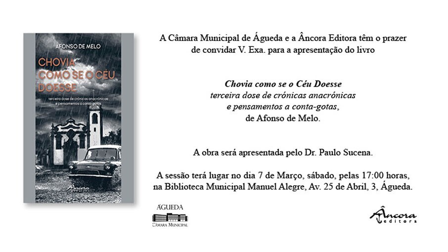 “Chovia como se o céu doesse – terceira dose de crónicas anacrónicas e pensamentos a conta-gotas” é o título do livro da autoria de Afonso de Melo, que vai ser apresentado no próximo sábado, dia 7, às 17 horas, na Biblioteca Municipal Manuel Alegre, em Águeda.
