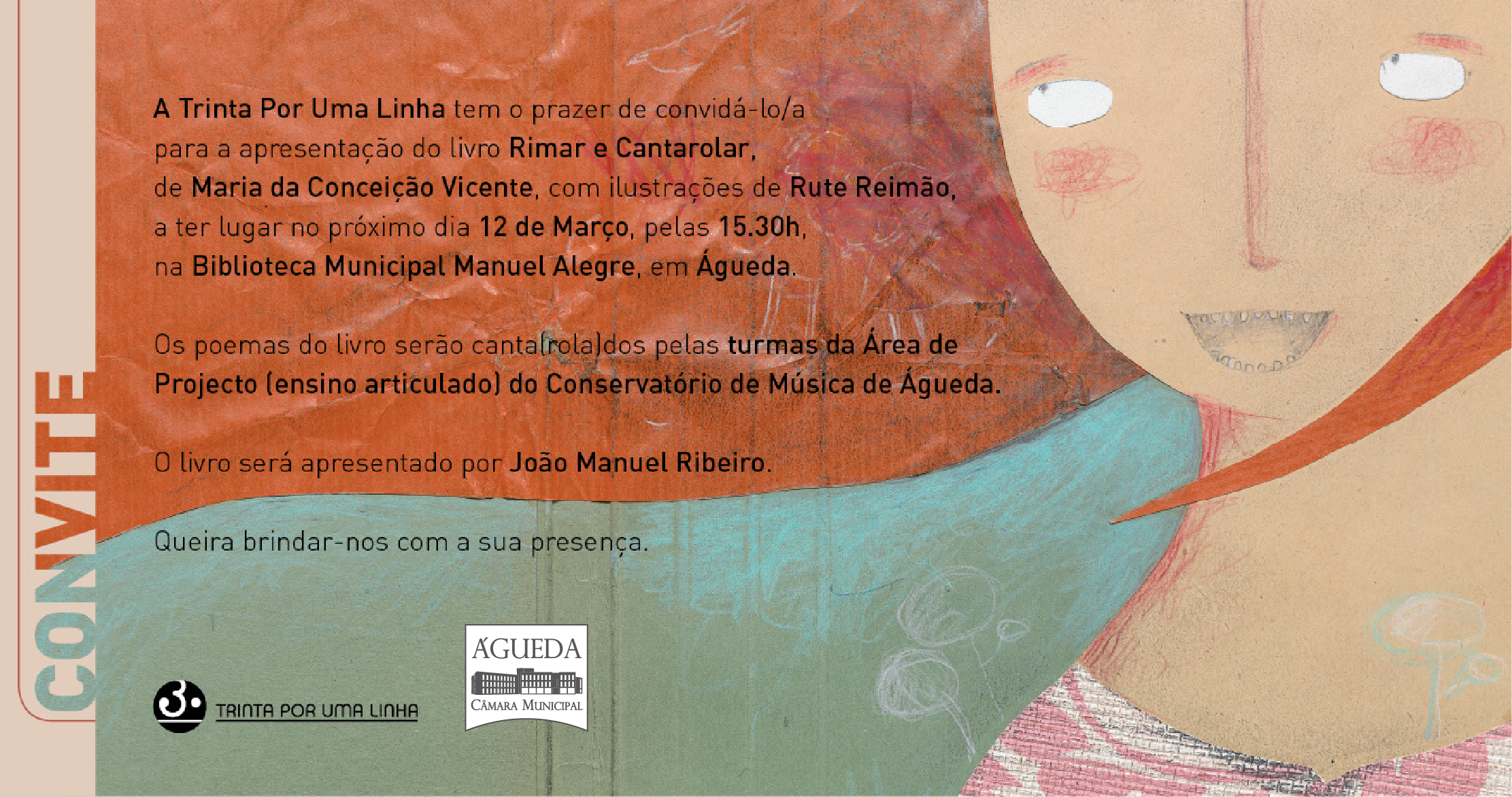 No dia 12 de Março, às 15:30, a sala polivalente da Biblioteca Municipal Manuel Alegre irá receber o lançamento do livro infantil “Rimar e Cantarolar” da autoria da Aguedense Maria da Conceição Vicente, e com ilustrações de Rute Reimão. A apresentação ficará a cargo de João Manuel Ribeiro.