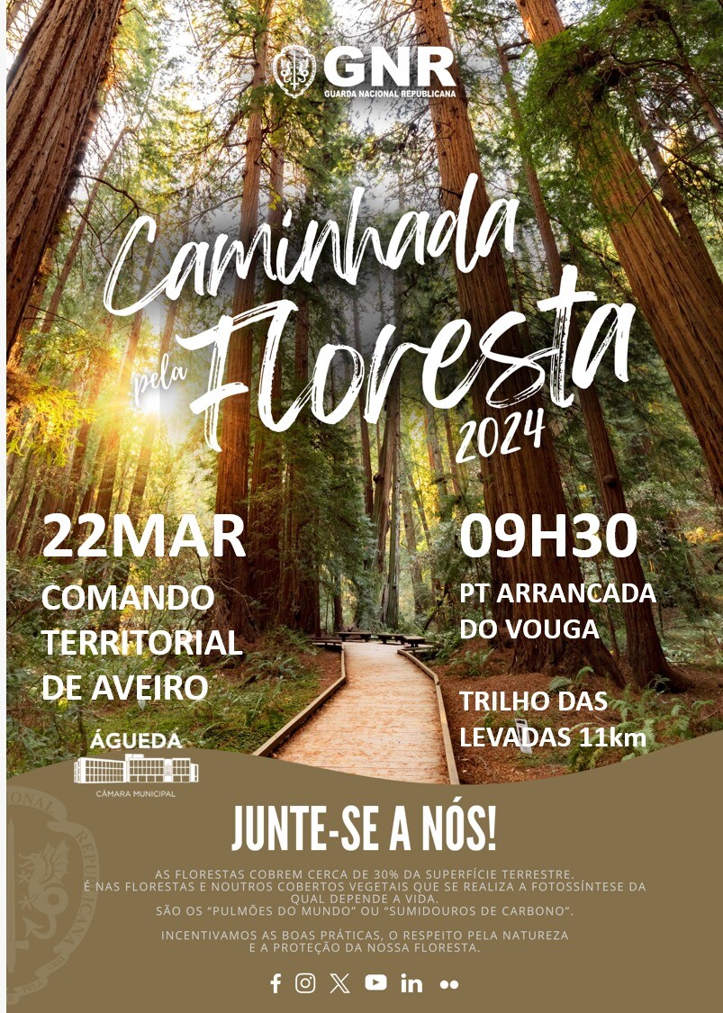 O Presidente da Câmara Municipal de Águeda, Jorge Almeida, e o Comandante do Destacamento Territorial de Águeda, Capitão Fernandes, convidam V. Exa. para a Caminhada pela Floresta, no próximo dia 22 de março de 2024, sexta-feira, pelas 09H30min, com o ponto de encontro no Posto Territorial de Arrancada do Vouga.