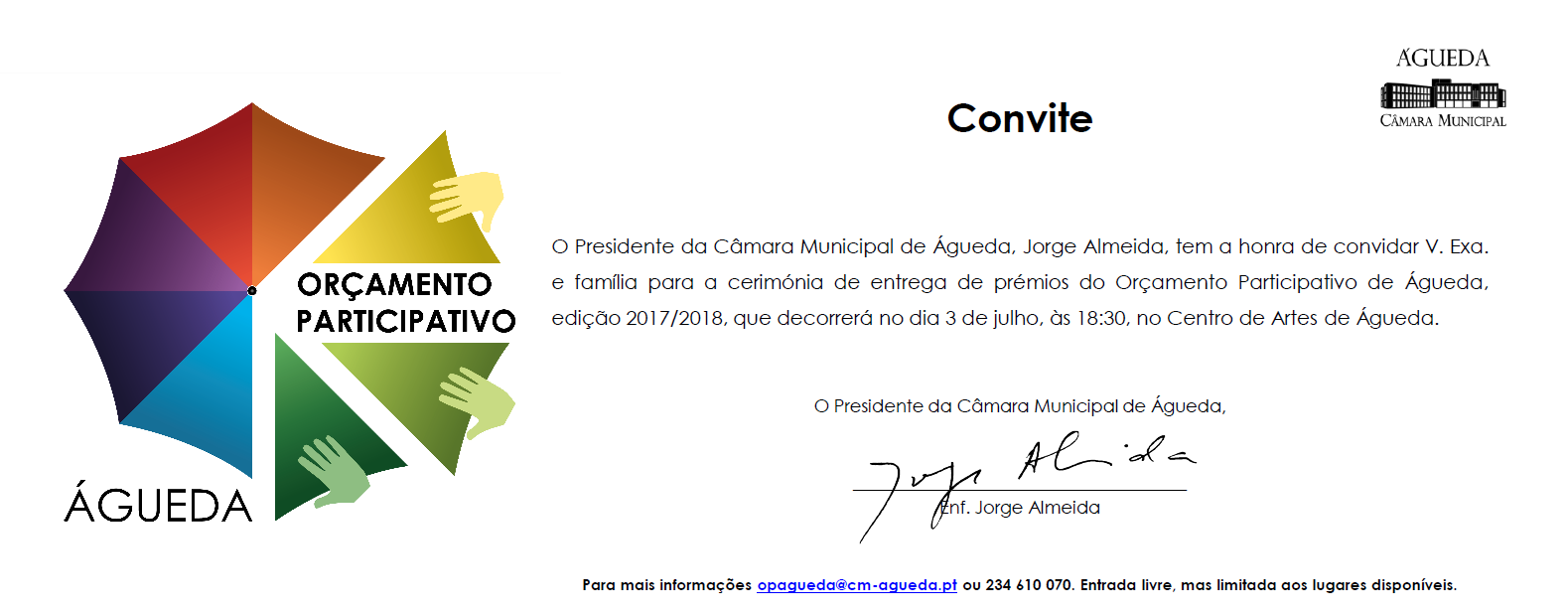 Irá realizar-se no próximo dia 3 de julho, às 18h30, no Centro de Artes de Águeda, a cerimónia de entrega de prémios da edição 2017/2018 do Orçamento Participativo de Águeda!
