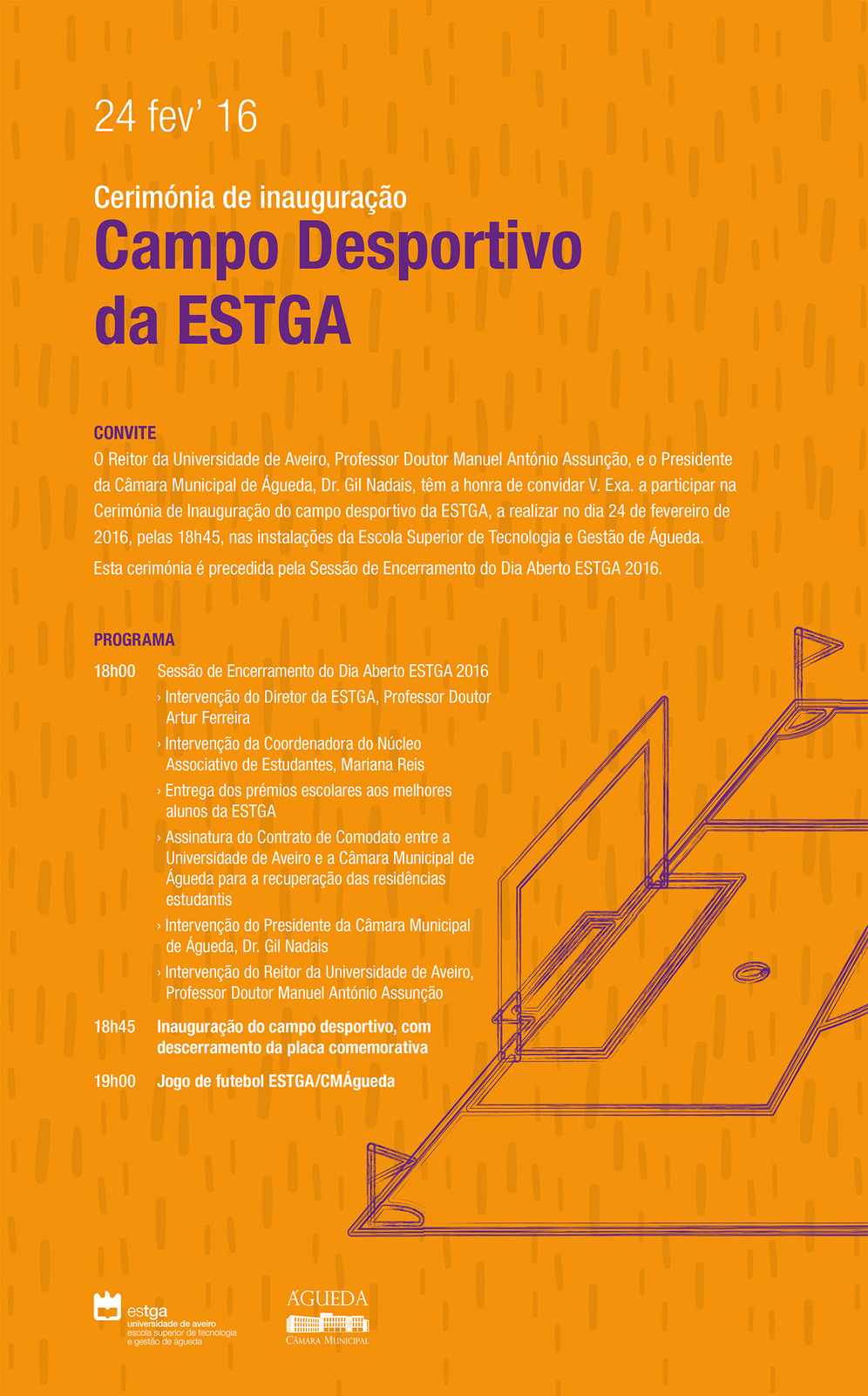 Cerimónia de Inauguração do campo polidesportivo da ESTGA, que terá lugar no próximo dia 24 de fevereiro, pelas 18:45 horas de acordo com o programa que anexo.