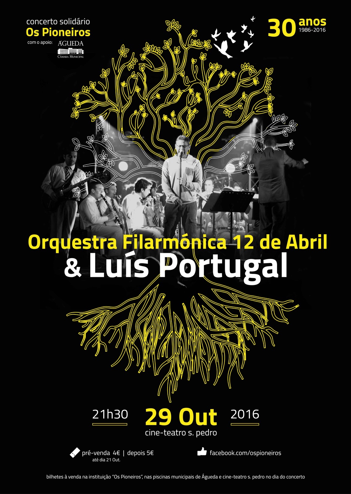 Ainda no âmbito das Comemorações do 30º Aniversário da Instituição Particular de Solidariedade Social “Os Pioneiros” e, considerando que trinta anos de existência e de trabalho em prol do outro é um motivo bastante significativo, pretendemos proporcionar a toda a comunidade aguedense um espetáculo fabuloso com a Orquestra Filarmónica 12 de Abril acompanhada pelo conhecido cantor Luis Portugal (antigo vocalista do Jafumega) e, simultaneamente, angariar alguma verba que contribua para a sustentabilidade da instituição. Assim, é com muito prazer que convidamos todos os Aguedenses para este evento. Os bilhetes estarão disponíveis para venda na secretaria da Instituição e também na Piscinas Municipais em Águeda.