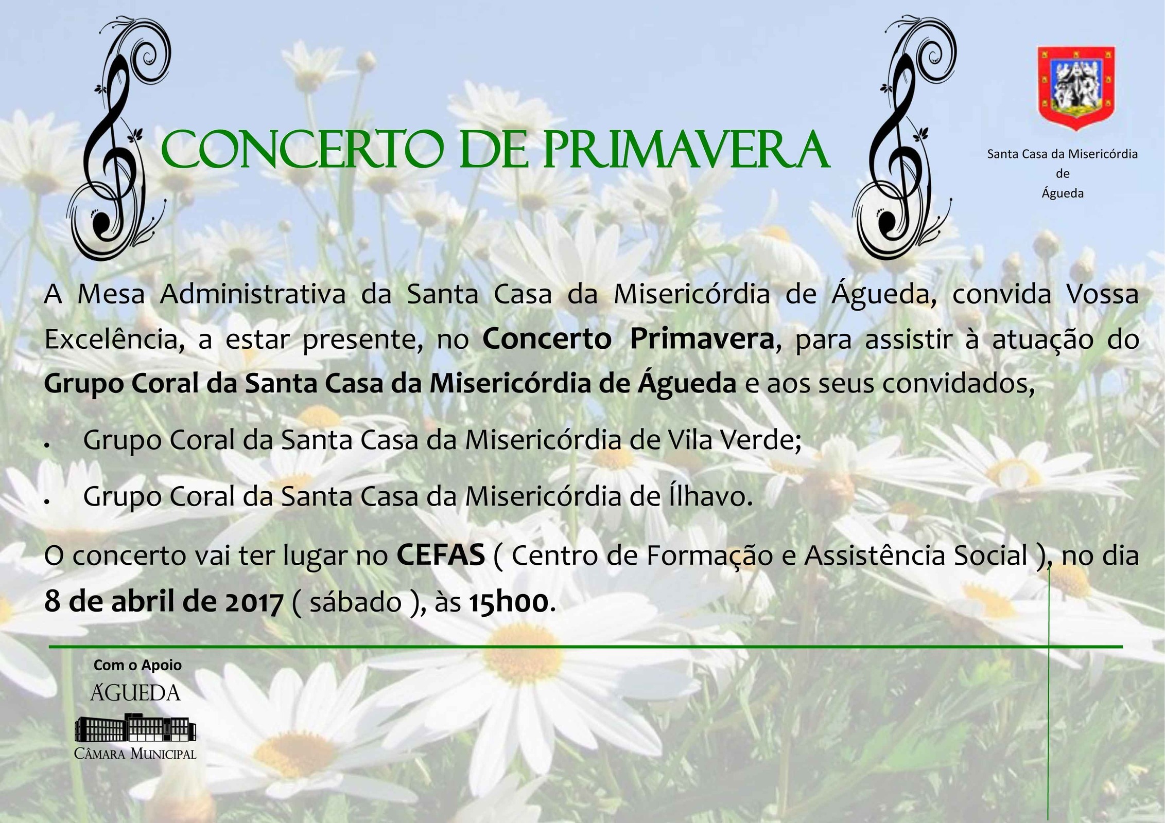 O Provedor e a Mesa Administrativa da Santa Casa da Misericórdia de Águeda, têm a honra de convidar V. Exa. e família para o “Concerto de Primavera”, que conta com a participação dos seguintes Grupos: