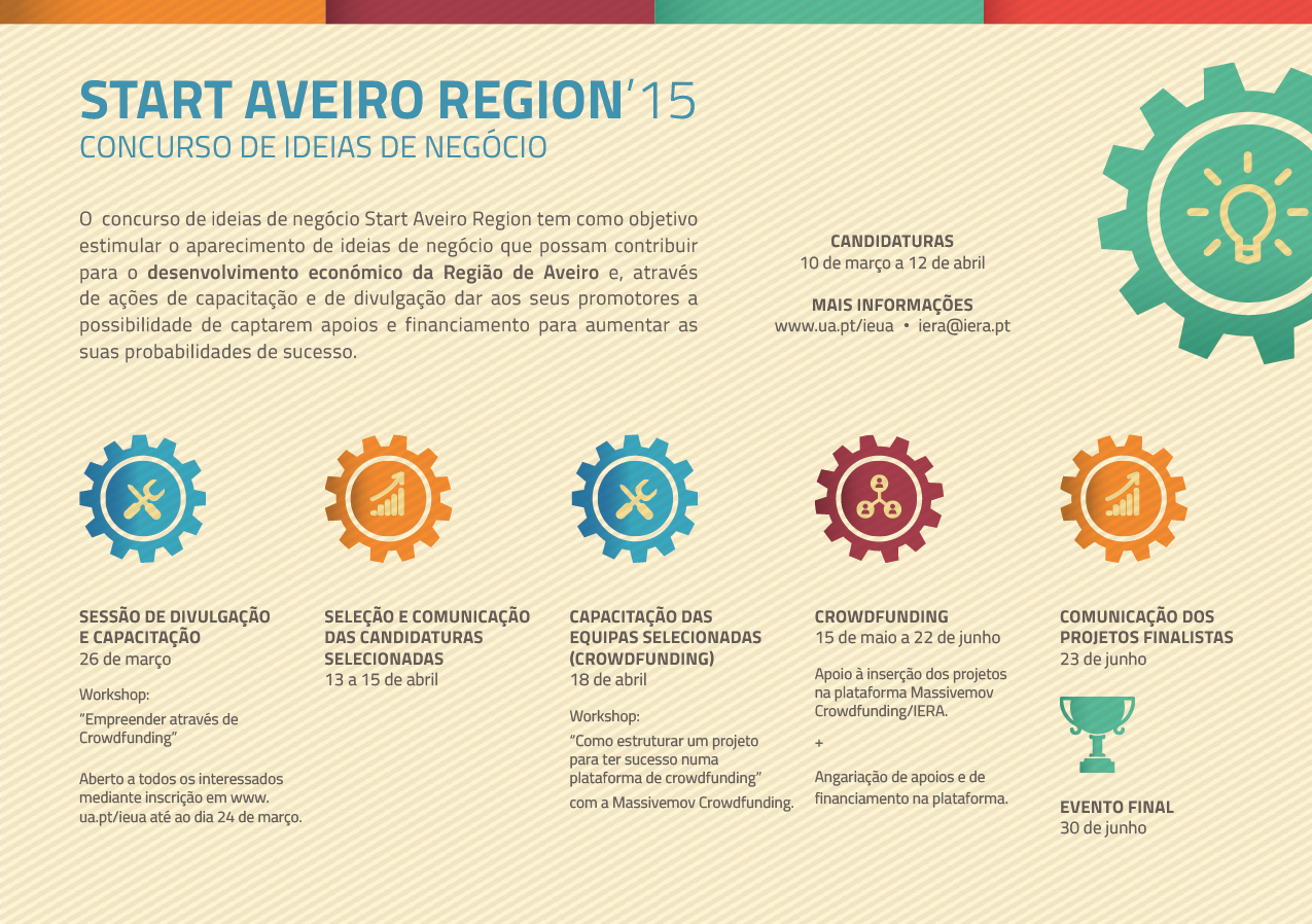 O Start Aveiro Region 2015 pretende estimular o aparecimento de ideias de negócio inovadoras e com elevado potencial de aplicabilidade, que contribuam para o desenvolvimento económico da Região de Aveiro, sendo constituído por três fases. A Fase I, período de submissão de candidaturas, decorre até 12 de abril. Segue-se o período de capacitação, Fase II, com a realização do workshop para os projetos selecionados sobre “Como estruturar um projeto para ter sucesso numa plataforma de crowdfunding”, com o objetivo de publicarem o seu projeto na plataforma Massivemov Crowdfunding para angariação de apoio e financiamento. Na Fase III, os projetos finalistas serão apresentados publicamente e será selecionado o vencedor.