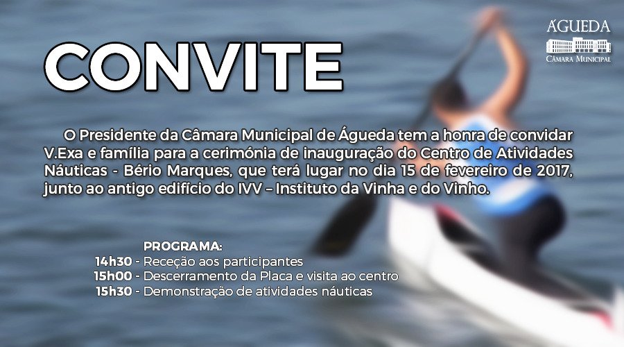 O Presidente da Câmara Municipal de Águeda tem a honra de convidar V.Exa e família para a cerimónia de inauguração do Centro de Atividades Náuticas - Bério Marques, que terá lugar no dia 15 de fevereiro de 2017, junto ao antigo edifício do IVV – Instituto da Vinha e do Vinho, pelas 14:30h.