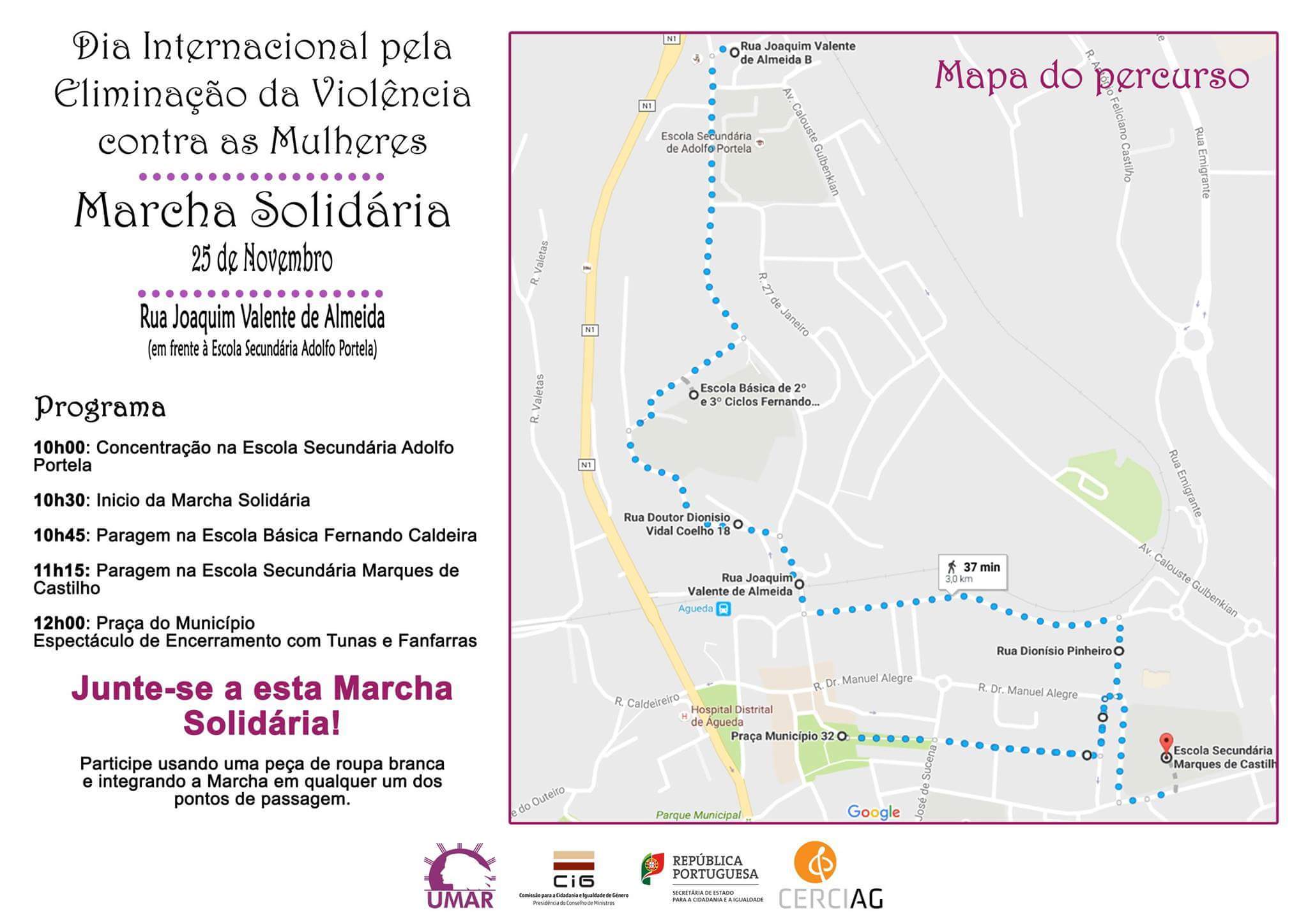 No próximo dia 25 de novembro, vai realizar-se uma Marcha Solidária para assinalar o Dia Internacional pela Eliminação da Violência Contra as Mulheres, organizada e dinamizada pela CERCIAG e pela UMAR, conforme cartaz em anexo.