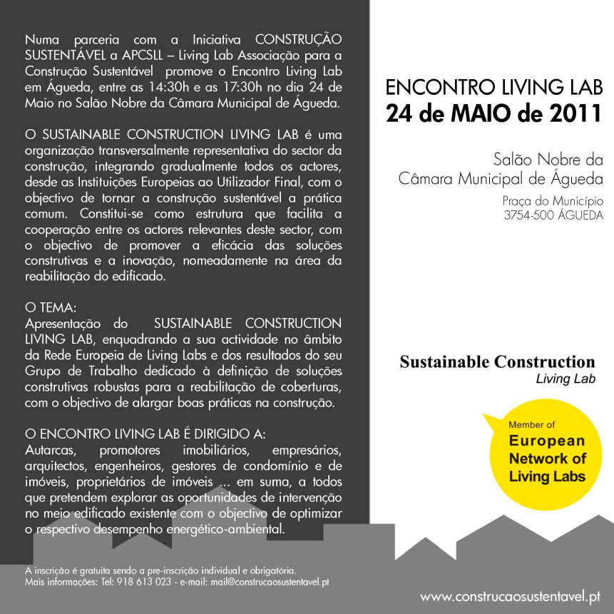 Numa parceria com a iniciativa Construção Sustentável a APCSLL – Living lab associação para a Construção sustentável promove o Encontro Living Lab em Águeda, entre as 14:30 e as 17:30, no dia 24 de Maio no Salão Nobre da Câmara Municipal de Águeda.