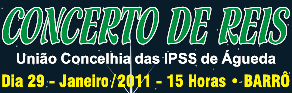 A União Concelhia das Instituições Particulares de Solidariedade Social do Concelho de Águeda vem por este meio convidar V. Exa. a estar presente no I Concerto de Reis organizado pela UCIPSS´s, a ocorrer no próximo dia 29 de Janeiro de 2011 pelas 15h no Centro Cívico Eng. Adolfo Roque em Barrô, conforme divulgação em anexo.
