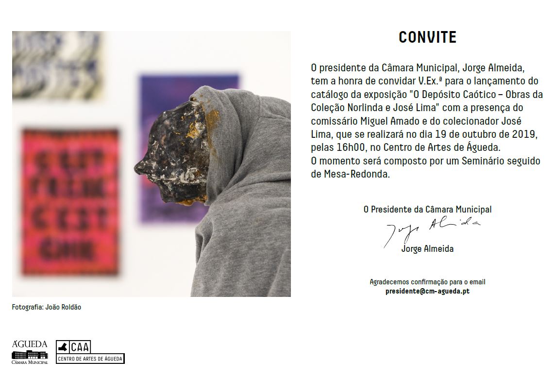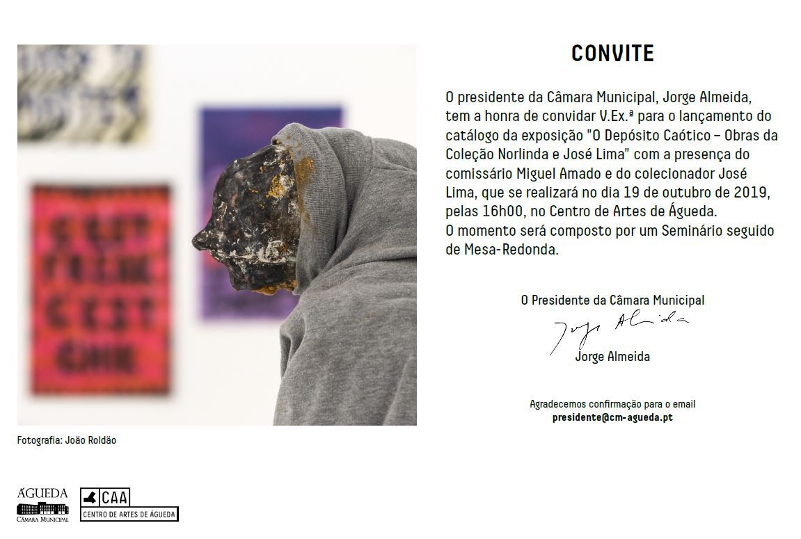 O presidente da Câmara Municipal, Jorge Almeida, tem a honra de convidar V.Ex.ª para o lançamento do catálogo da exposição "O Depósito Caótico - Obras da Coleção Norlinda e José Lima" com a presença do comissário Miguel Amado e do colecionador José Lima, que se realizará no dia 19 de outubro de 2019, pelas 16h00, no Centro de Artes de Águeda.