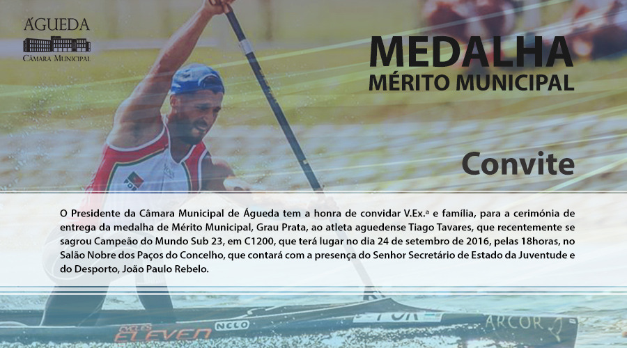O Presidente da Câmara Municipal de Águeda tem a honra de convidar V.Exa e família, para a cerimónia de entrega da medalha de Mérito Municipal, Grau Prata, ao atleta aguedense Tiago Tavares, que recentemente se sagrou Campeão do Mundo Sub-23, em C1200, que terá lugar no dia 24 de setembro de 2016, pelas 18 horas, no Salão Nobre dos Paços do Concelho, que contará com a presença do Senhor Secretário de Estado da Juventude e do Desporto, João Paulo Rebelo.