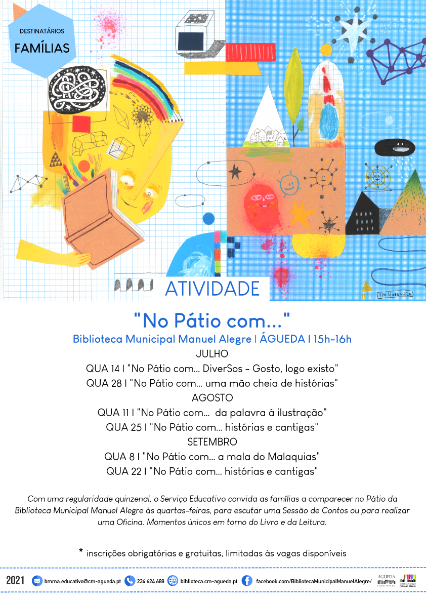 Com uma regularidade quinzenal, o Serviço Educativo convida as famílias a comparecer no Pátio da Biblioteca Municipal Manuel Alegre às quartas-feiras, para escutar uma Sessão de Contos ou para realizar uma Oficina. Momentos únicos em torno do Livro e da Leitura, onde a imaginação e a criatividade também terão lugar reservado.