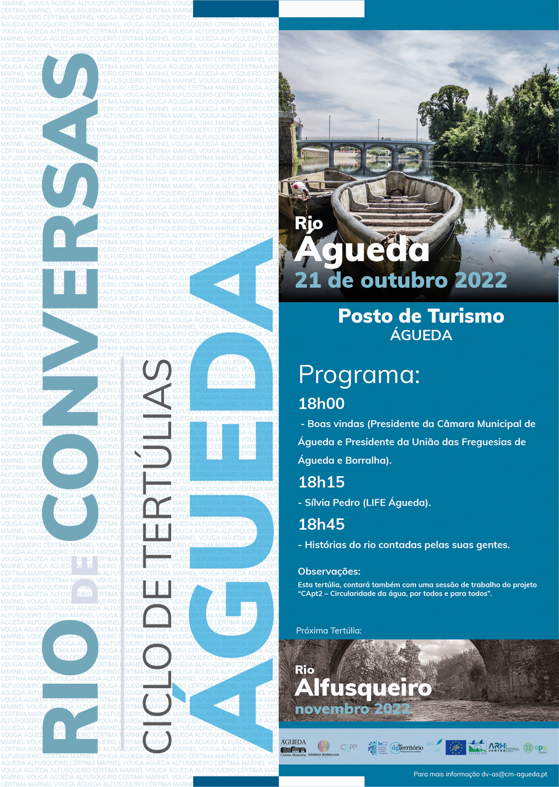 A Câmara Municipal de Águeda está a promover um ciclo de tertúlias intitulado “Rio de Conversas”, que tem como foco central os rios, as práticas e as tradições ligadas aos principais cursos de água do concelho. A próxima conversa, que terá como tema o Rio Águeda, está agendada para dia 21 de outubro, às 18h00, no Posto de Turismo de Águeda.