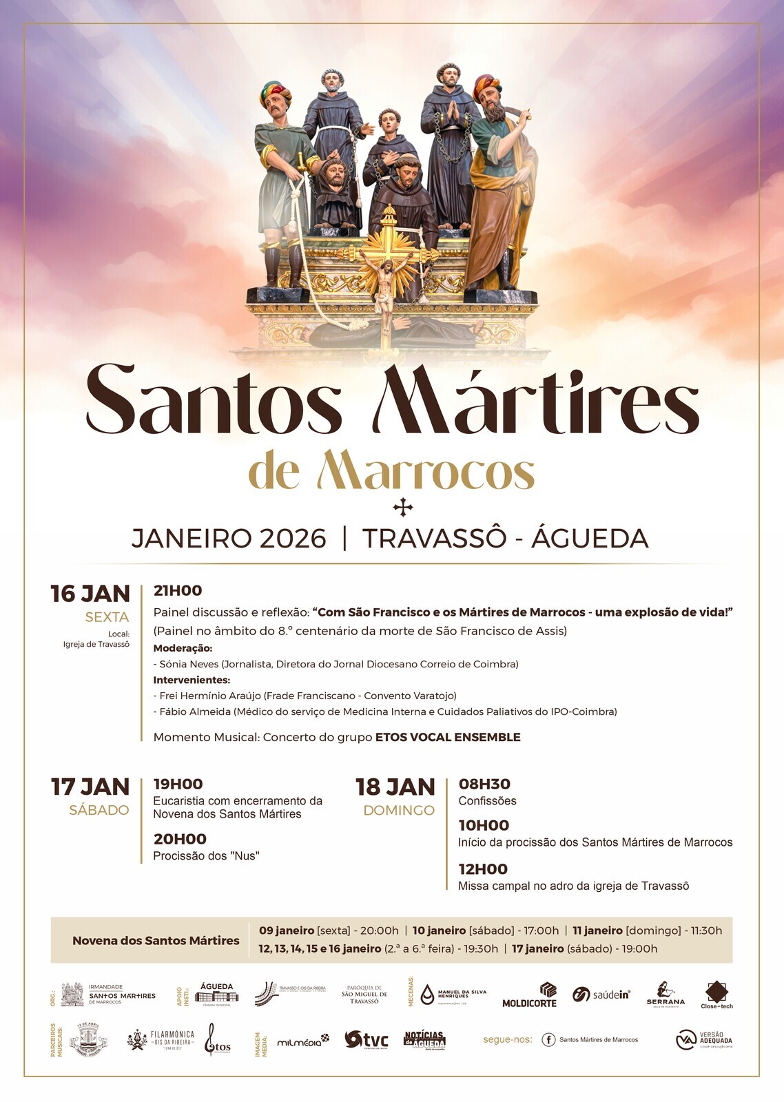 A Romaria que lembra o martírio dos Protomártires Franciscanos – Berardo, Pedro, Adjuto, Otão e Acúrsio - primeiros mártires da Ordem de São Francisco de Assis, volta a acontecer nos dias 16, 17 e 18 de janeiro em Travassô - Águeda.