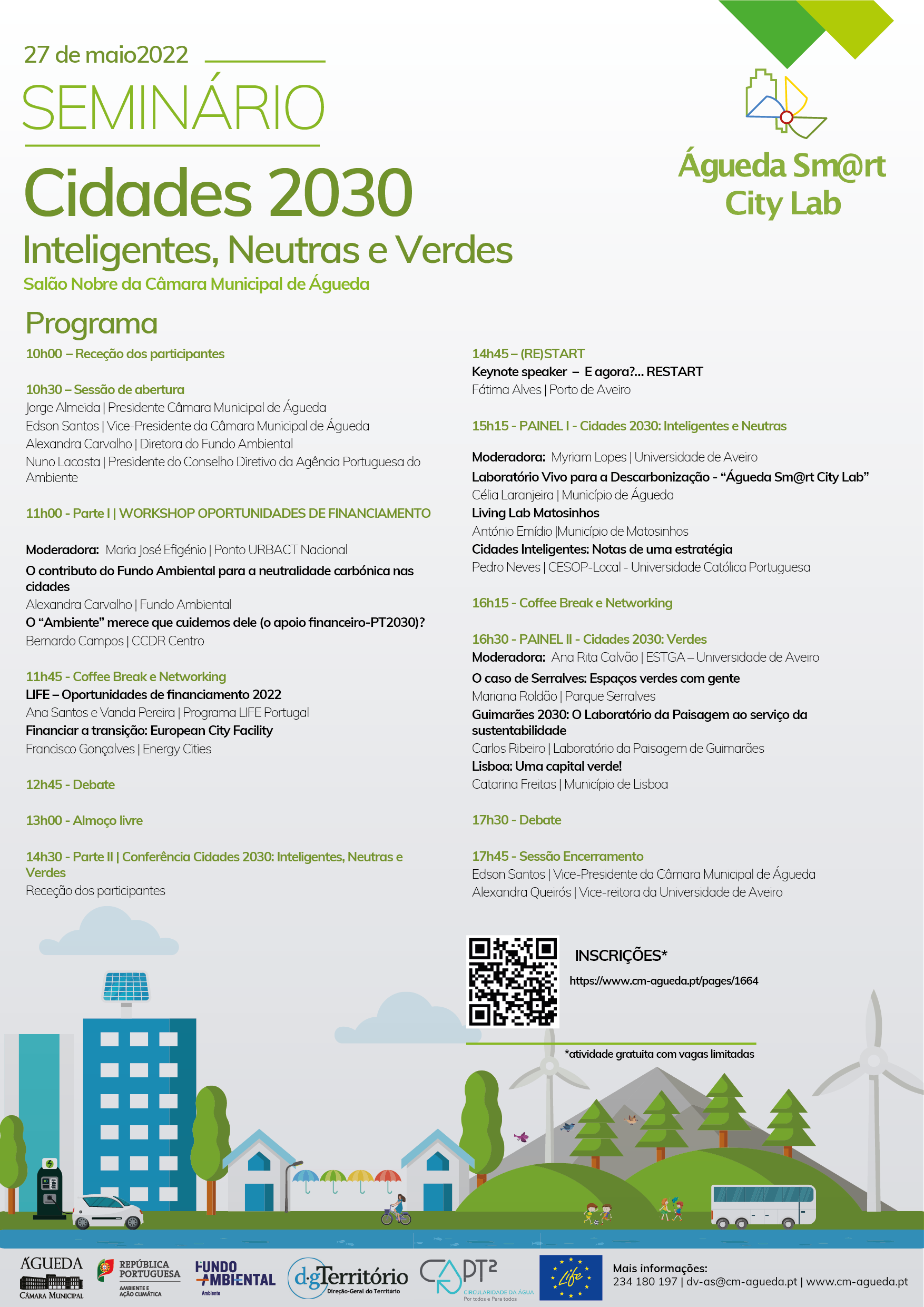 Mais informações em: https://www.cm-agueda.pt/viver/ambiente-e-sustentabilidade/ambiente/acoes/cidades-2030-inteligentes-neutras-e-verdes