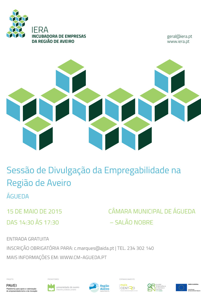 As Sessões de Divulgação da Empregabilidade na Região de Aveiro estão inseridas no projeto PAVEI – Plataforma para Apoio e Valorização do Empreendedorismo e da Inovação, cofinanciado pelo Programa MaisCentro – Programa Operacional da Região Centro, no âmbito da operacionalização da Incubadora de Empresas da Região de Aveiro (IERA).