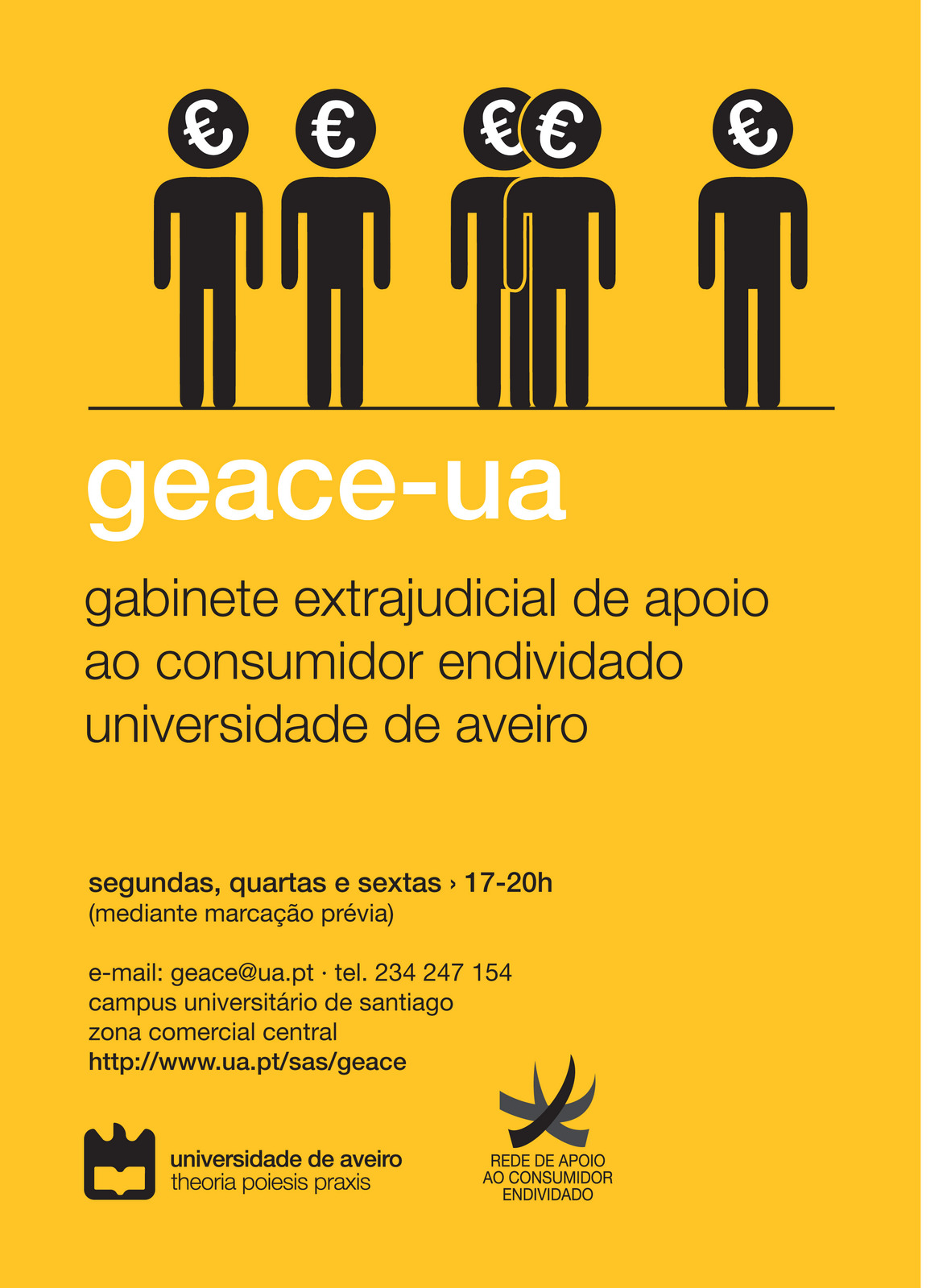 A Câmara Municipal em articulação com o Gabinete Extrajudicial de Apoio ao Consumidor Endividado da Universidade de Aveiro – GEACE-UA, promove, no dia 18-02-2016, pelas 18,00h, no Salão Nobre da Câmara Municipal, uma sessão aberta à população em geral e a dirigentes e técnicos de Instituições/ Associações, com vista à apresentação do trabalho que o gabinete desenvolve. A ação deste gabinete, concretiza-se através de ações de informação/aconselhamento do consumidor, de ajuda na gestão do orçamento familiar e de renegociação dos encargos /créditos bancários e destina-se a todos os consumidores que têm dificuldades no cumprimento de contratos de crédito, quer porque se encontram em risco de incumprimento; quer porque já têm prestações de crédito em atraso.