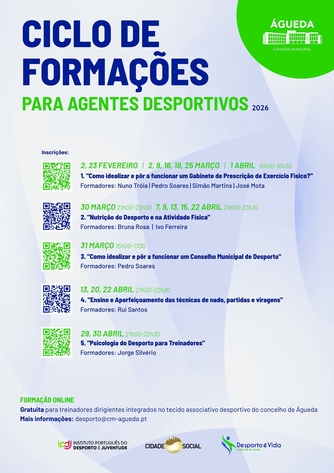 A Câmara Municipal de Águeda em parceria com a Cidade Social promove, nos meses de fevereiro, março e abril de 2026, o Ciclo de Formações para Agentes Desportivos, uma iniciativa estratégica que visa qualificar, valorizar e capacitar todos os intervenientes no ecossistema desportivo do concelho de Águeda.