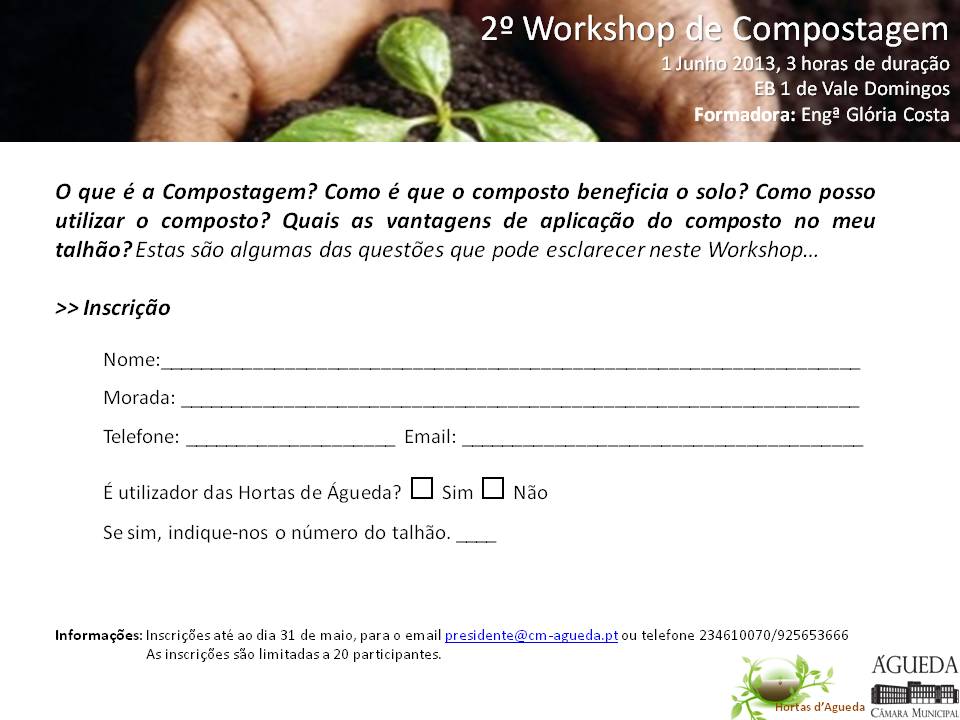 Na sequência da implementação das Hortas d’Águeda, os hortelões identificaram como necessidade o correto encaminhamento do resíduos agrícolas, pelo que a Autarquia decidiu promover um Workshop, onde pretende responder a questões como: O que é a Compostagem? Como é que o composto beneficia o solo? Como posso utilizar o composto? Quais as vantagens de aplicação do composto no meu quintal/talhão?