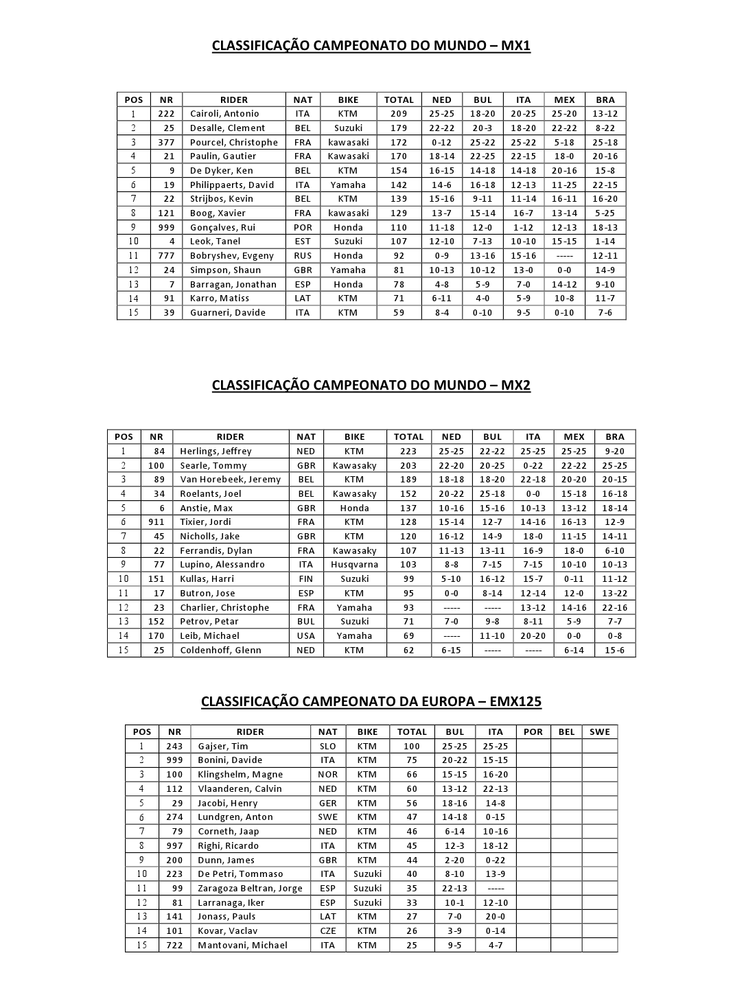 Classificação em MX1, MX2, e EMX125