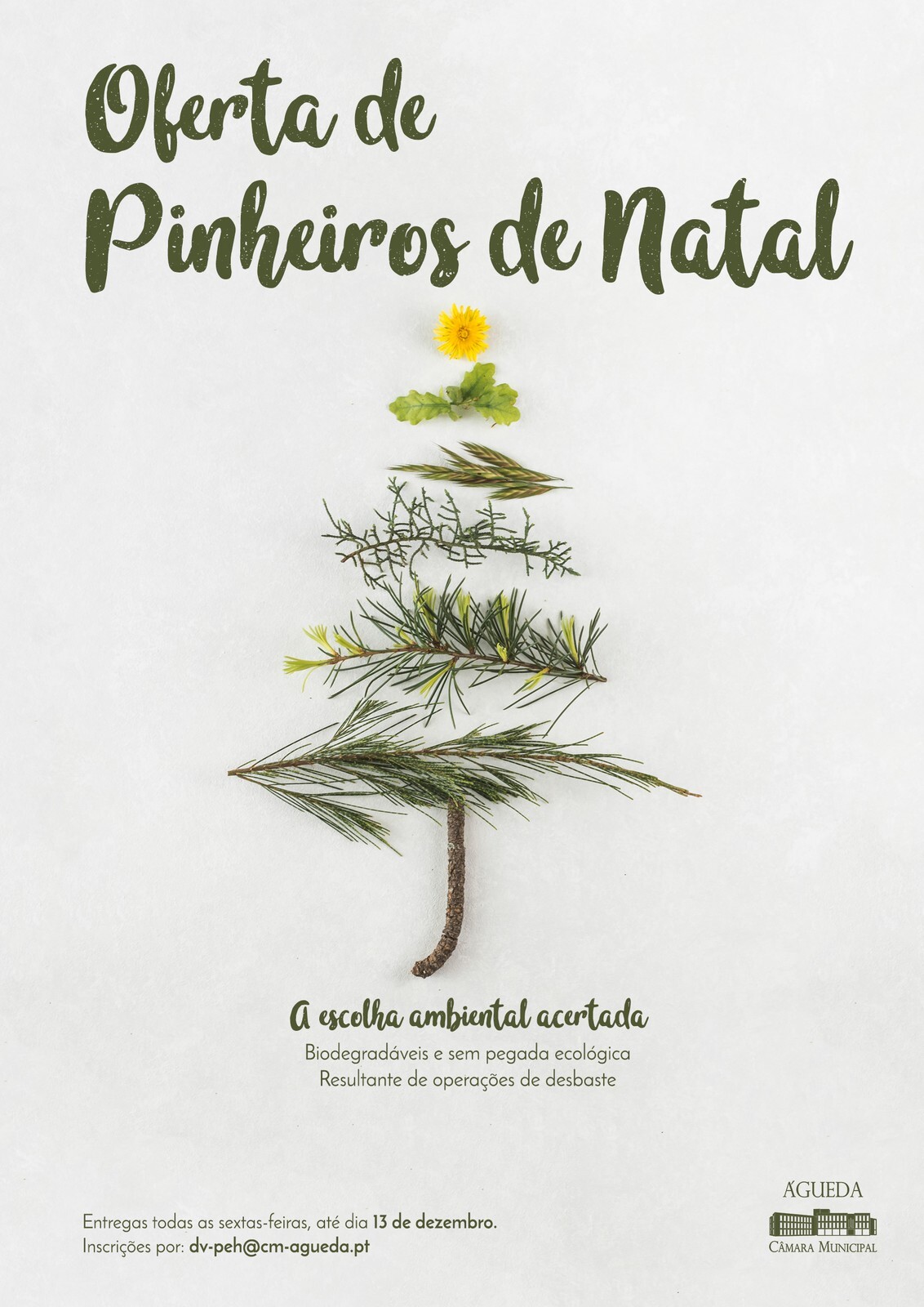 Assim, todos os interessados num pinheiro de Natal biodegradável e sem pegada ecológica, poderão manifestar o seu interesse através do email dv-peh@cm-agueda.pt. Contribua para um município mais sustentável.