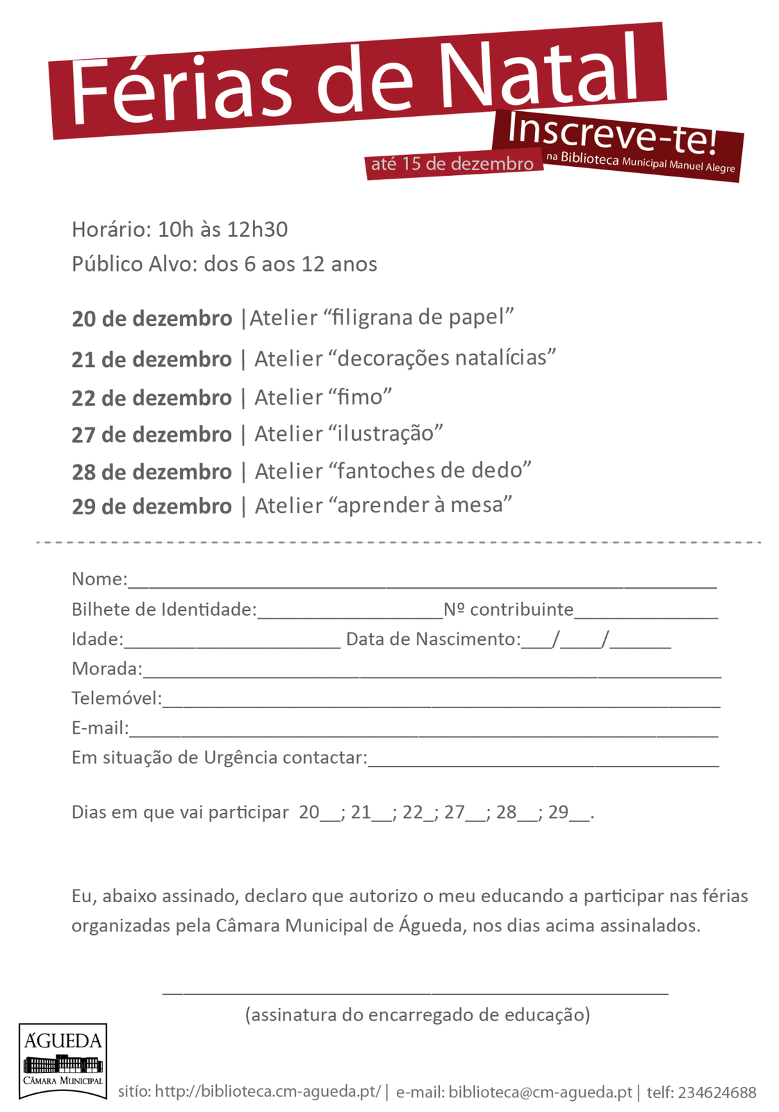 Os interessados deverão fazer a sua inscrição na Biblioteca Municipal Manuel Alegre ou através do endereço de correio-electrónico biblioteca@cm-agueda.pt até às 13:00 de 15 de Dezembro. As inscrições são limitadas.