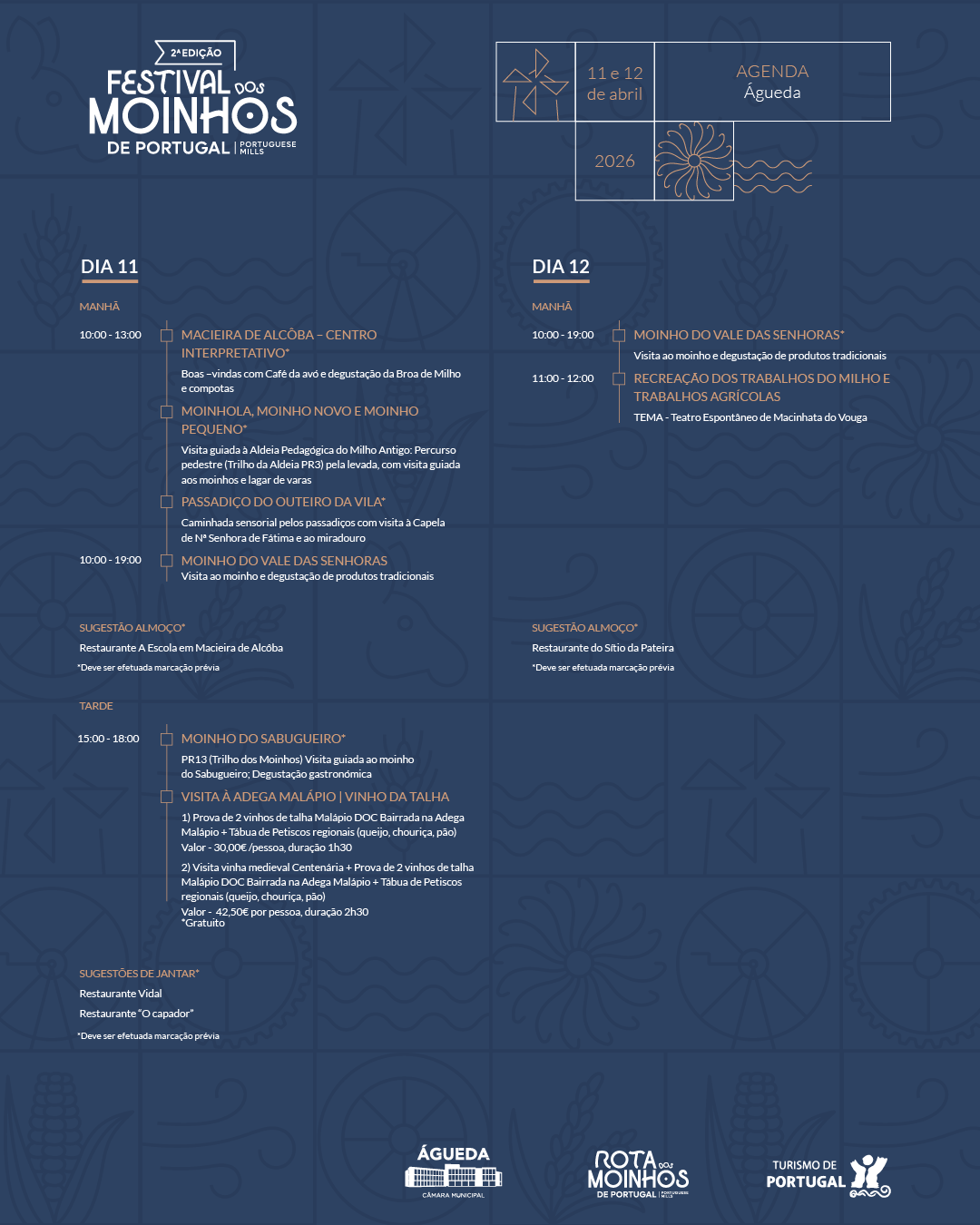 No domingo, 12 de abril, o foco é o Moinho do Vale das Senhoras, aberto das 10h00 às 19h00, com visita ao moinho, degustação de produtos tradicionais (sopa à lavrador, rojões e broa) e recriações de trabalhos agrícolas pelo TEMA - Teatro Espontâneo de Macinhata do Vouga. Todas as atividades no moinho são gratuitas, permitindo que famílias e visitantes vivam de perto a tradição molinológica.