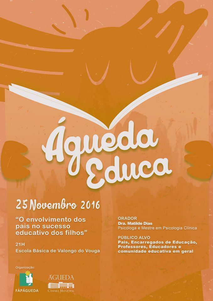 Dando continuidade ao projeto iniciado em 2014, a FAPAGUEDA – Federação Concelhia das Associações de Pais do Concelho de Águeda, em parceria com a Câmara Municipal de Águeda, levará a cabo, no dia 25 novembro, mais uma palestra no âmbito do projeto "Águeda Educa" pelas 21:00 horas, na Escola Básica de Valongo do Vouga.