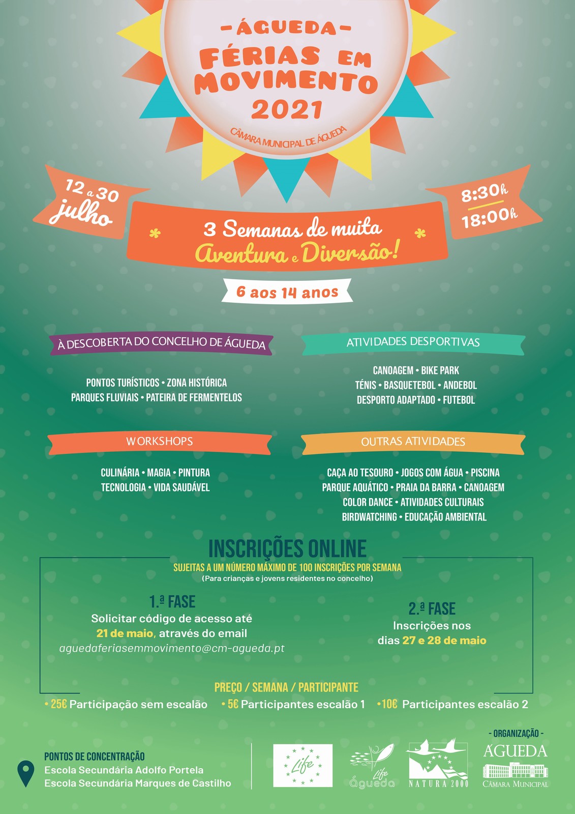 A Câmara Municipal de Águeda irá promover o projeto "Águeda - Férias em movimento", entre os dias 12 e 30 de julho, para as crianças e jovens com idades compreendidas entre os 6 e os 14 anos, residentes no concelho de Águeda, num total máximo de 100 participantes por semana.