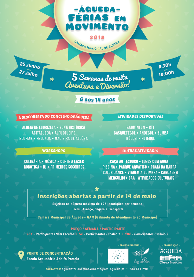 Cinco semanas de muita aventura e diversão é a garantia que o Município de Águeda deixa às crianças e jovens entre os 6 e os 14 anos que participarem no Férias em Movimento 2018, que irá decorrer entre os dias 25 de junho e 27 de julho, das 8h30 às 18h00.