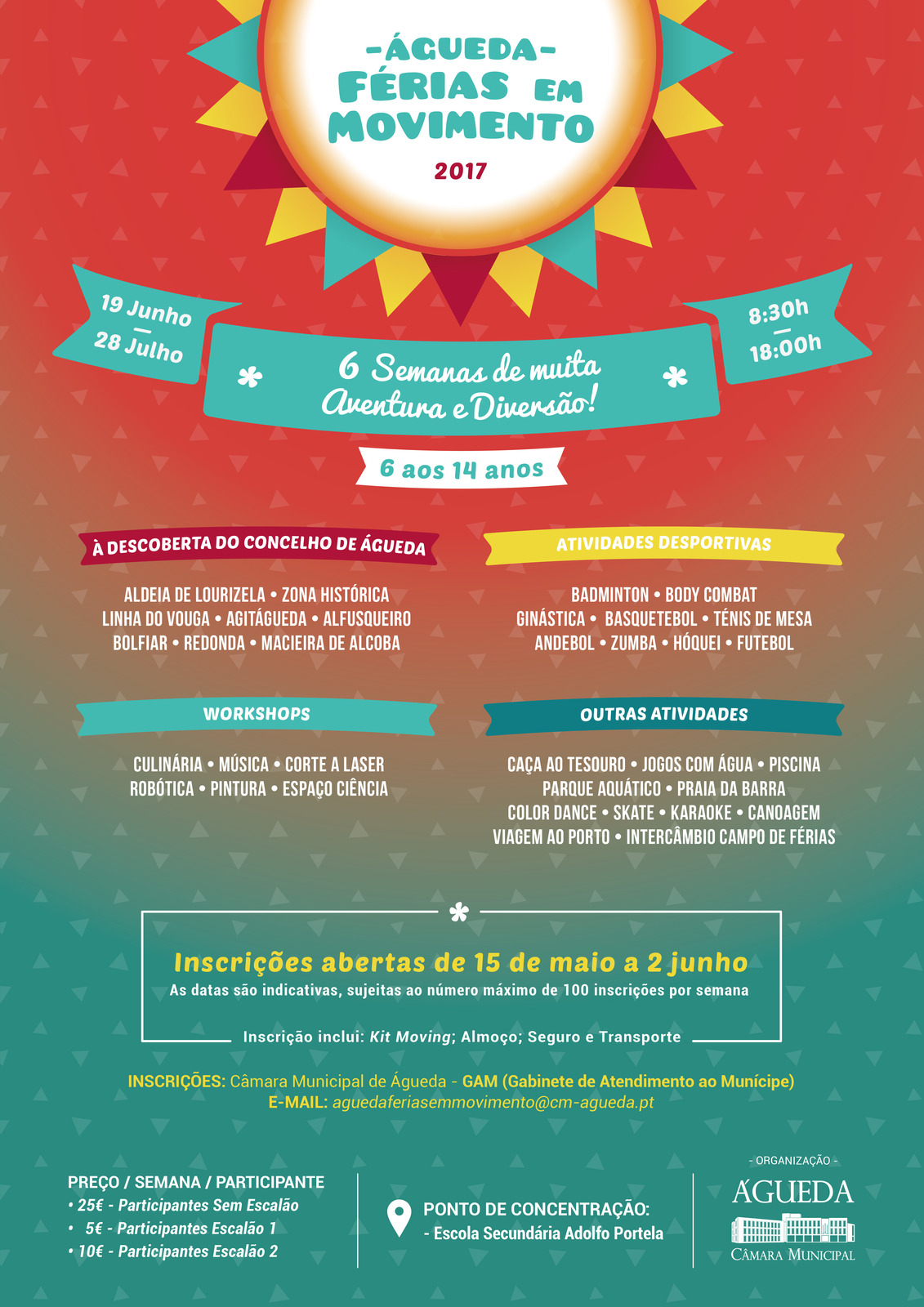 Seis semanas de muita aventura e diversão é a garantia que o Município de Águeda deixa às crianças e jovens entre os 6 e os 14 anos que participarem no Férias em Movimento 2017, que decorre entre os dias 19 de junho e 28 de julho, das 8h30 às 18h00.