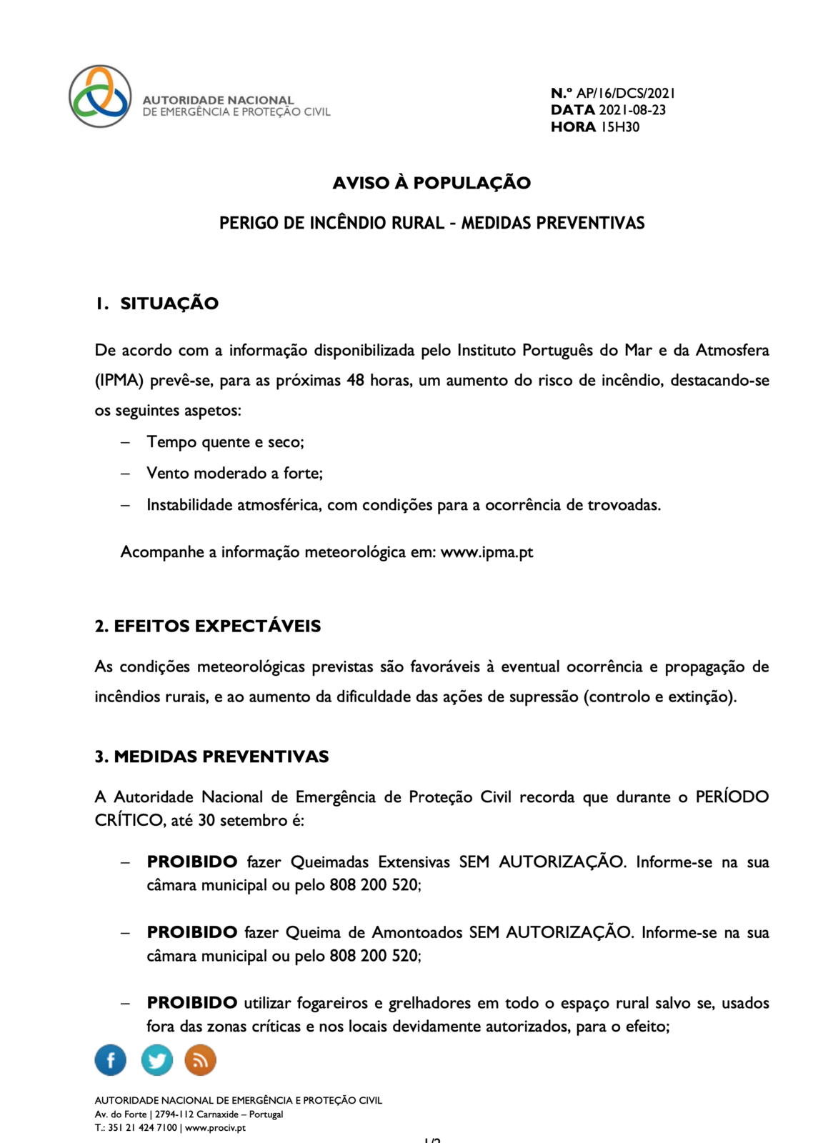 AVISO À POPULAÇÃO _ PERIGO DE INCÊNDIO RURAL _ RECOMENDAÇÕES À POPULAÇÃO _ 23 agosto 2021