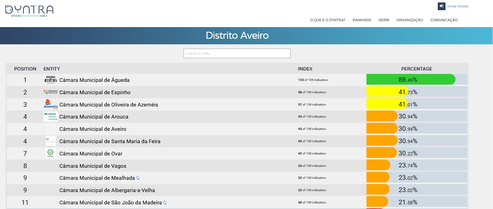Os dados, que podem ser consultados em www.dyntra.org, revelam que a Câmara de Águeda obteve 88,49% com 123 indicadores avaliados (entre 139), que analisam aspetos como a informação disponível sobre a organização e sua composição, planos e relatórios municipais, a relação com o cidadão, a contratação pública, a transparência económico financeira e na área do urbanismo, entre outras.