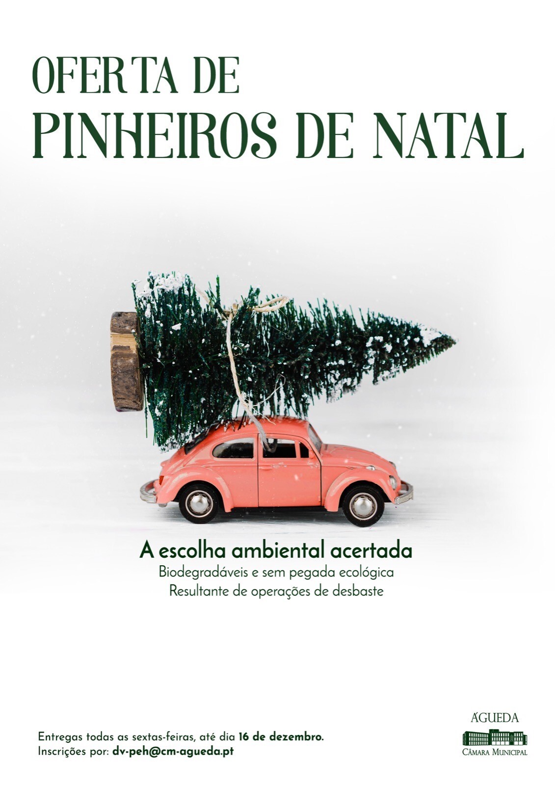 A Câmara Municipal de Águeda, consciente da importância da implementação de boas práticas ambientais e que promovam a reutilização dos resíduos, à imagem do que tem feito nos últimos anos, disponibiliza gratuitamente pinheiros naturais para poderem ser usados pelos aguedenses como árvore de Natal ecológica.
