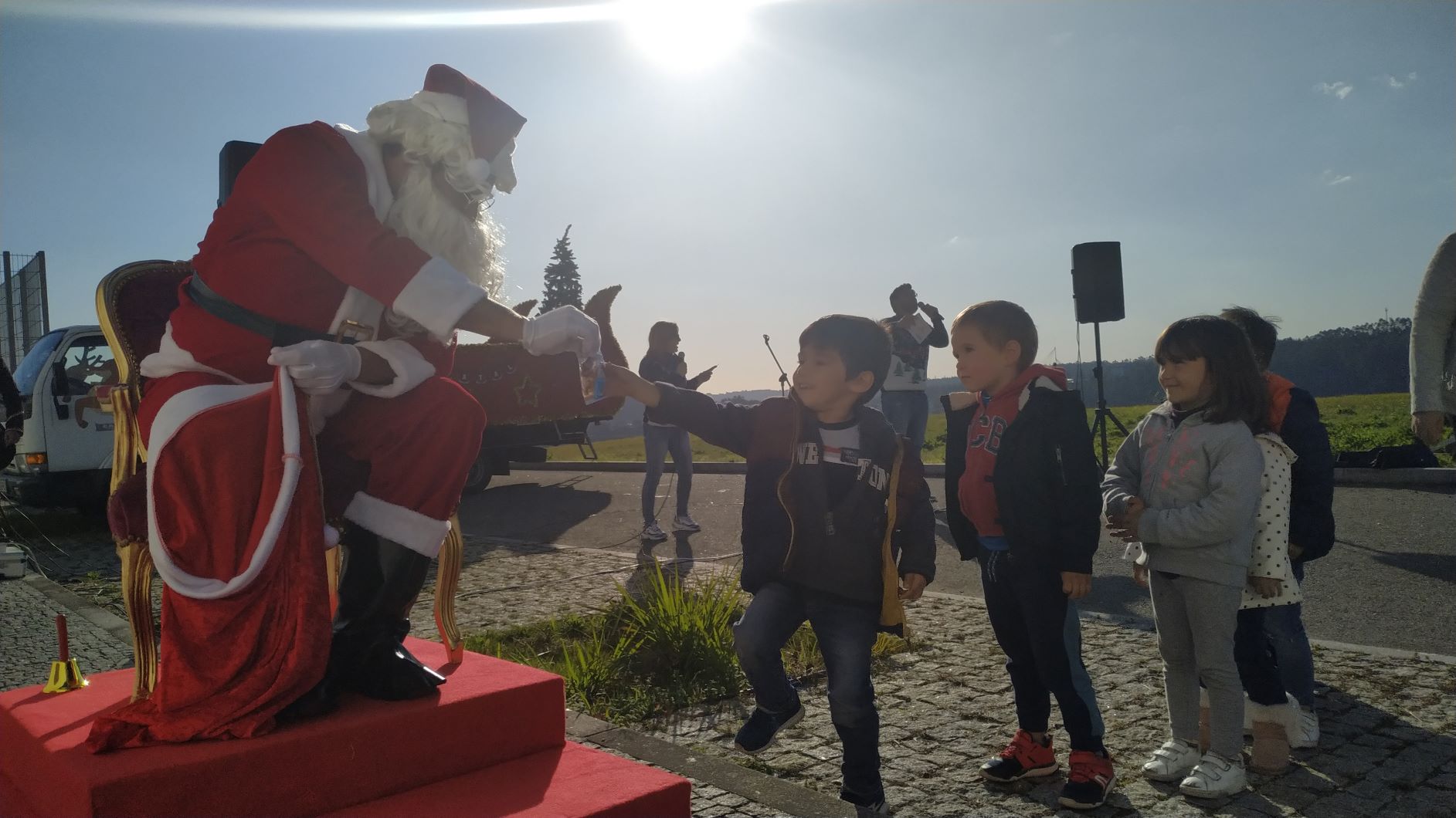 O espetáculo iniciou com a chegada do Pai Natal no seu “trenó”, um veículo móvel devidamente decorado, causando gritos contagiantes de alegria de toda a criançada. Depois, sentado no seu cadeirão, o Pai Natal distribuiu uma pequena lembrança a cada criança. Simultaneamente, o espetáculo continuava, com dois músicos a interpretarem algumas músicas natalícias.
