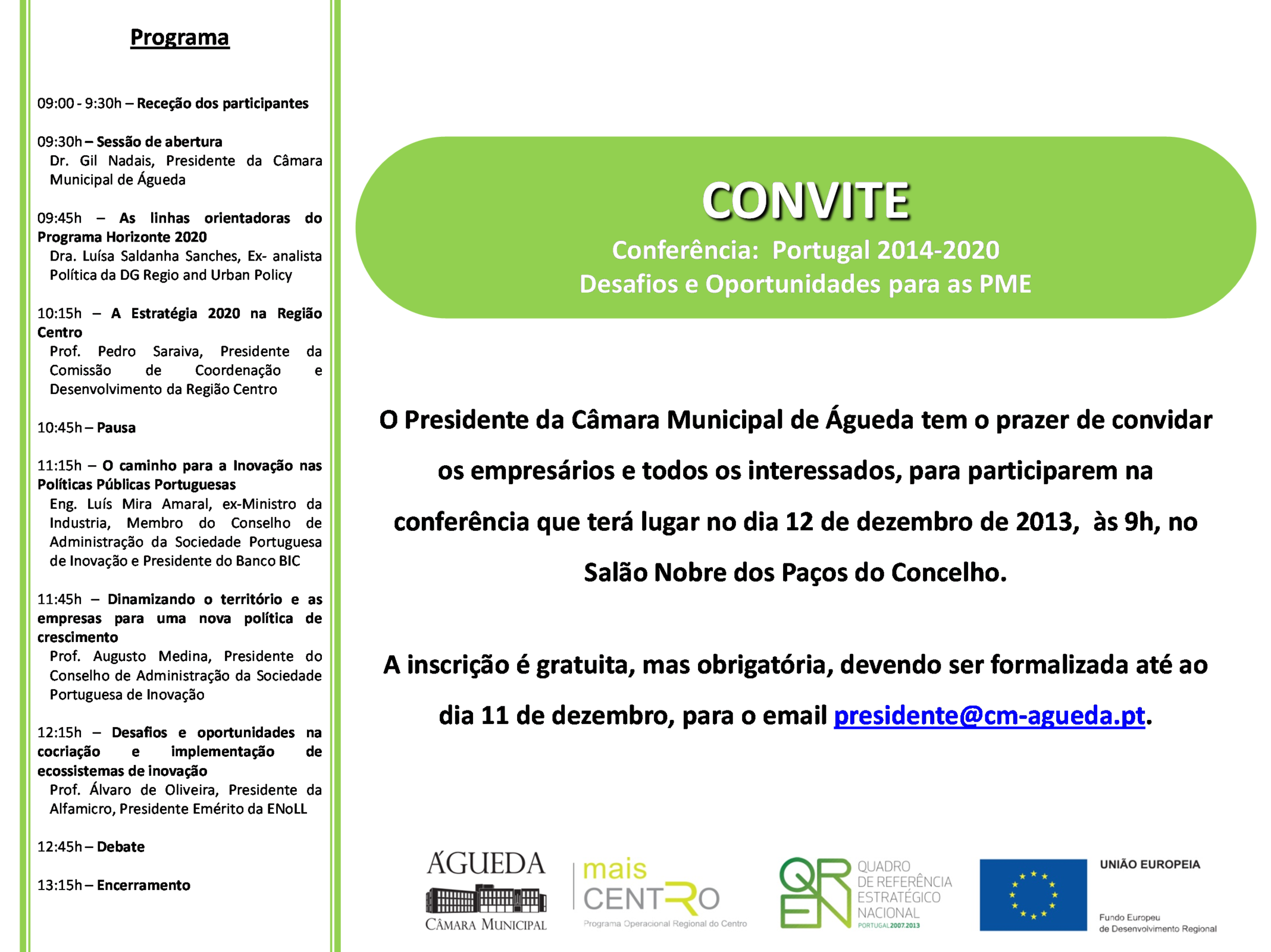Realiza-se no próximo dia 12 de dezembro, no SalãoNobre dos Paços de Concelho, em Águeda, às 9:00, a conferência "Portugal 2014-2020: Desafios e Oportunidades para as PME", que se reveste de interesse para os empresários, bem para todos os interessados.
