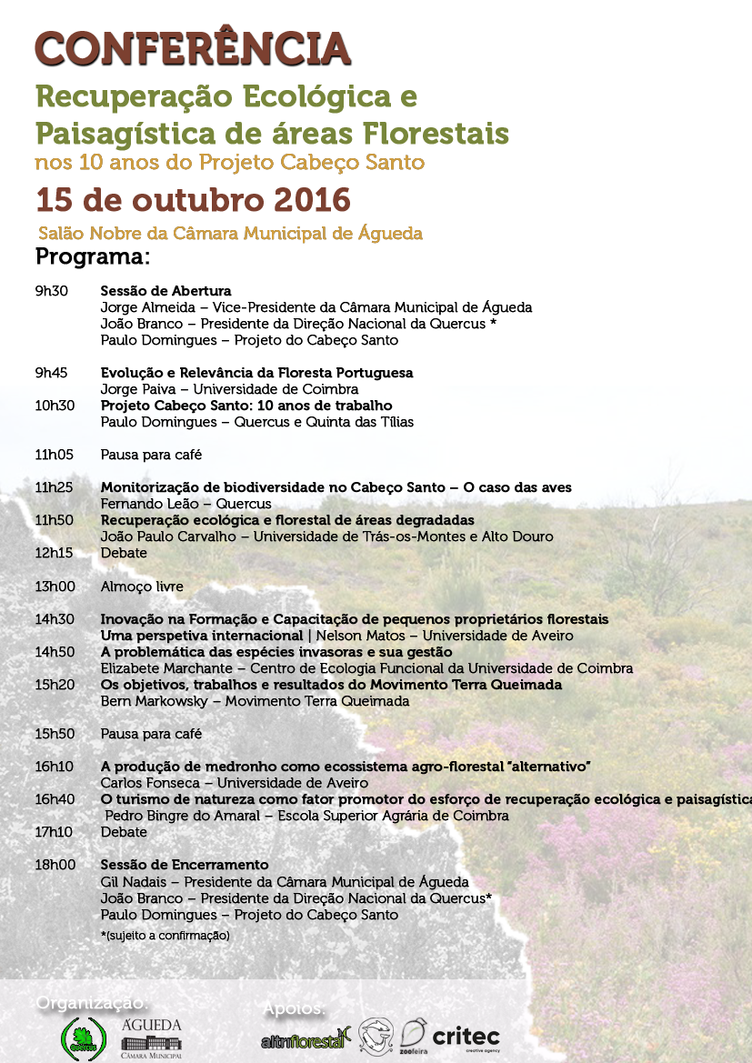 Enquadrado nas comemorações do 10º aniversário do projeto de Recuperação Ecológica do Cabeço Santo, irá ter lugar no Salão Nobre da Câmara Municipal de Águeda a Conferência "Recuperação Ecológica e Paisagística de áreas Florestais", no próximo dia 15 de outubro.