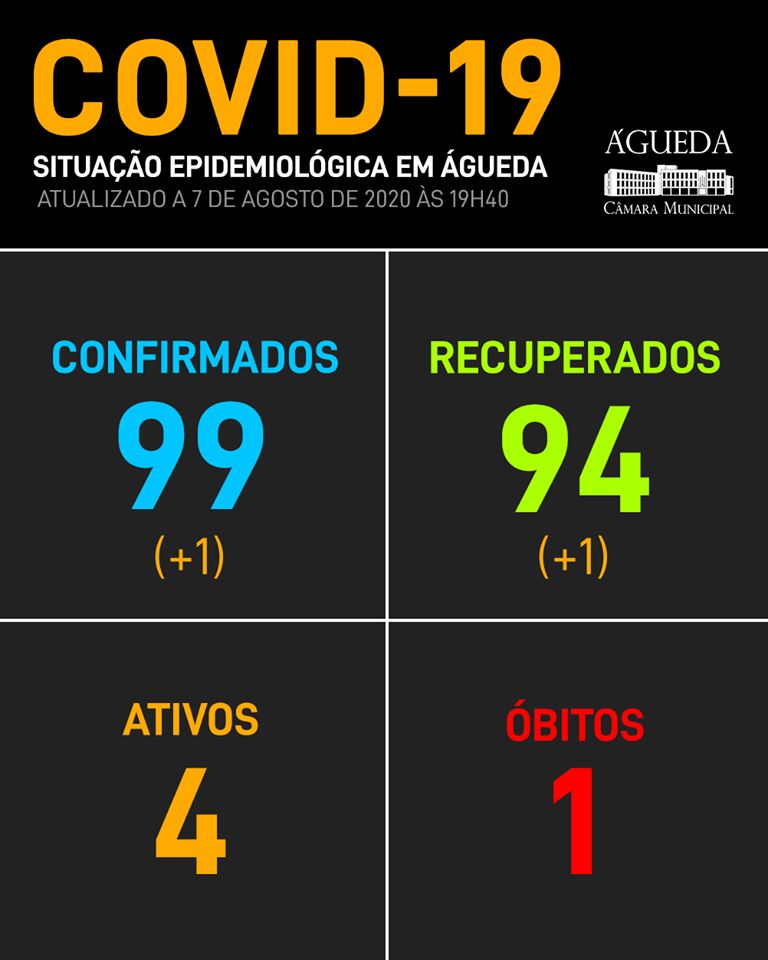 O Agrupamento de Centros de Saúde (ACeS) do Baixo Vouga anuncia que, hoje, em Águeda, há a registar um novo caso positivo de COVID-19. Assim, desde o início da pandemia, Águeda contabiliza 99 casos confirmados (mais um relativamente a terça-feira), entre os quais se contam 94 pessoas recuperadas (mais uma) e um óbito, pelo que permanecem ativos quatro casos do novo coronavírus.