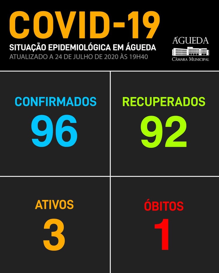 Não há qualquer alteração à situação epidemiológica no concelho de Águeda relativamente aos dados comunicados na terça-feira. Desde o início da pandemia, há 96 casos positivos de COVID-19, sendo que 92 são recuperados e há um óbito a lamentar. Estão, assim, ativos no concelho três casos do novo coronavírus.